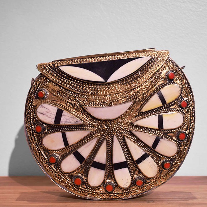 Bolso de fiesta con base de latón dorada envejecida labrada con preciosas formas. En este clutch de artesanía marroquí de forma semicicular se combinan los colores blancos y (...)