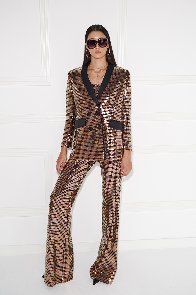 Espectacular chaqueta americana confeccionada en un tejido de punto negro con lentejuelas redondas en tonos bronze de gran calidad. (...)