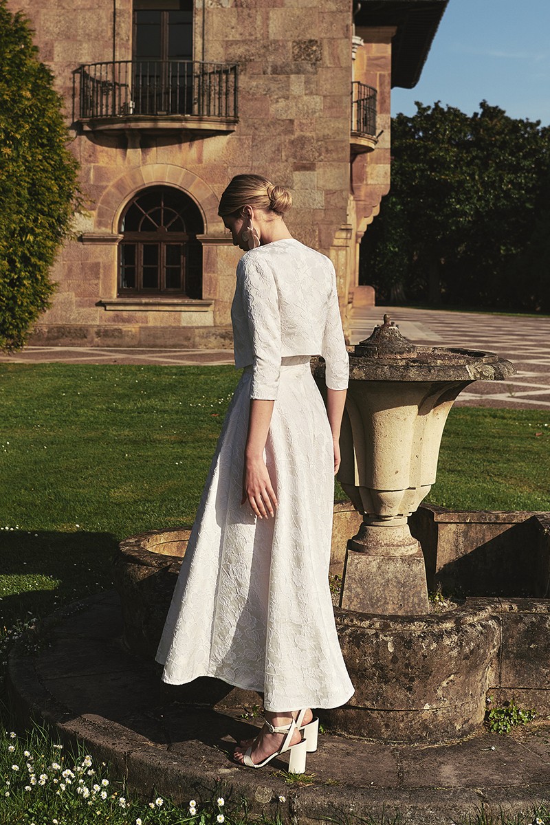 Chaqueta corta confeccionada en un precioso tejido brocado con flores relieve de color blanco. (...)