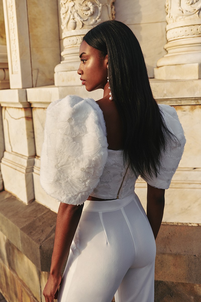 Precioso top joya confeccionado en tul fantasía con flores en relieve del propio tejido y pailletes/rocalla en el centro de la flor en color blanco. (...)