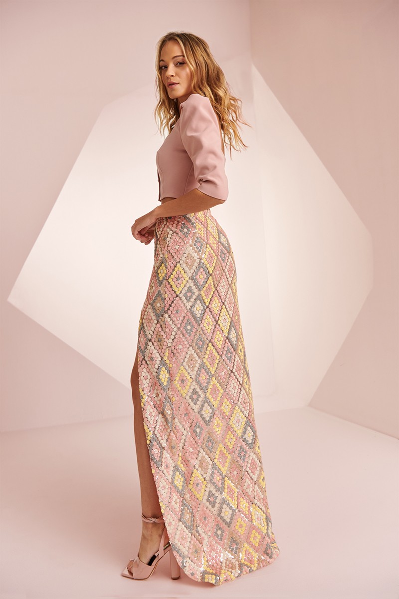 Preciosa falda larga confeccionada en lentejuela de rombos en tonos pasteles con abertura. Ajustada en la cintura, corte entallado que estiliza y favorece la figura femenina. (...)