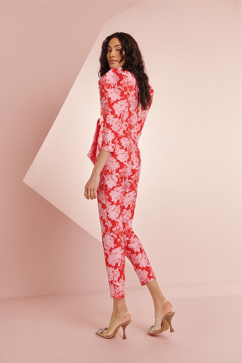 Precioso mono con escote en pico y mangas abullonadas, confeccionadon en un tejido brocado de gran calidad en color rojo con flores rosas. Lleva lazada para atar en la parte delantera y remarcar (...)