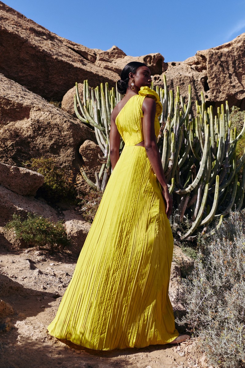 Precioso vestido de fiesta largo confeccionado en tafeta de gran calidad en color lima. Diseño asimétrico con corte en la cintura. Lleva una abertura lateral en el cuerpo que (...)