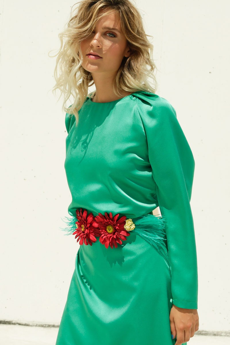 Cinturón de flores compuesto de dos margaritas centrales cuyos pétalos son en un bonito e intenso color rojo y los estigmas en verde musgo. A cada lado hay tres capullos de rosas en (...)