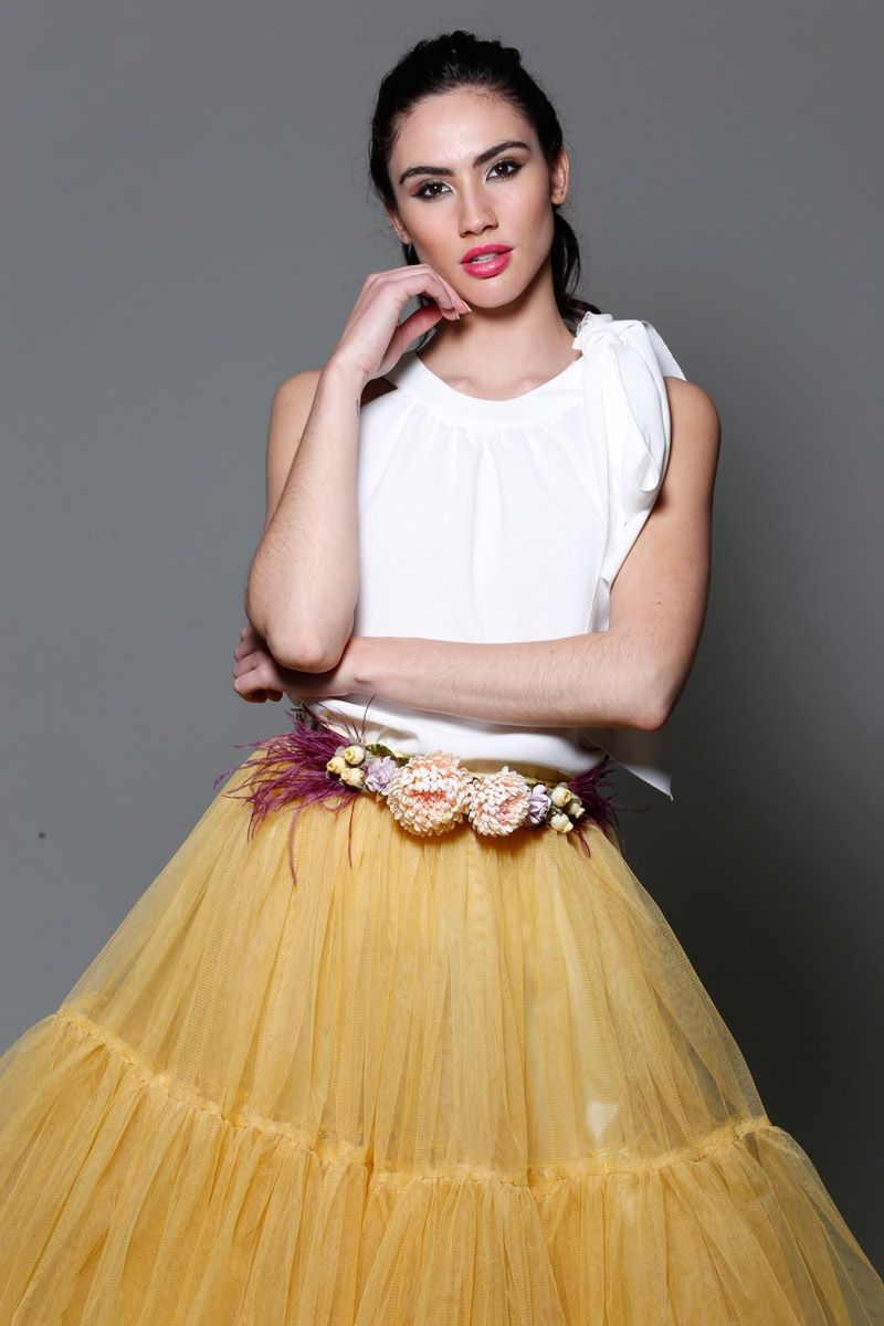 Cinturón de flores compuesto por dos flores centrales en color amarillo y pequeñas flores y hojas en tonos amarillo, verde y lila. Plumas de marábú en color frambuesa en (...)
