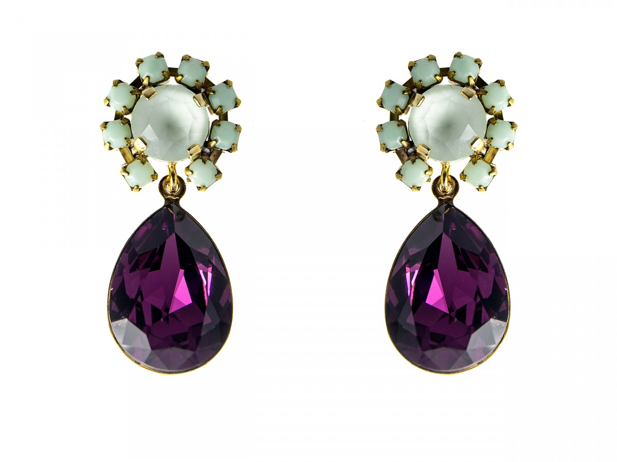 Pendientes realizados a mano con cristalitos de Swarovski en color verde oscuro, colgante en fucsia y strass de color menta, sobre una estructura de latón con baño dorado. (...)