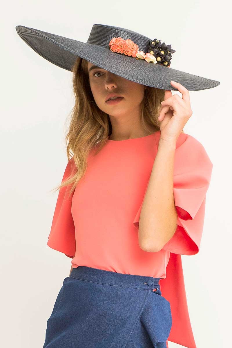 Preciosa pamela de rafia azul marino con flores en tonos coral, naranja y azul marino. (...)