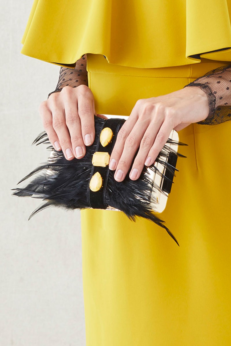 Bolso de fiesta con base de latón dorada. Lleva 1 tira negra de terciopelo vertical, plumas en color negro y tres piedras en color amarillo colocadas verticalmente (...)