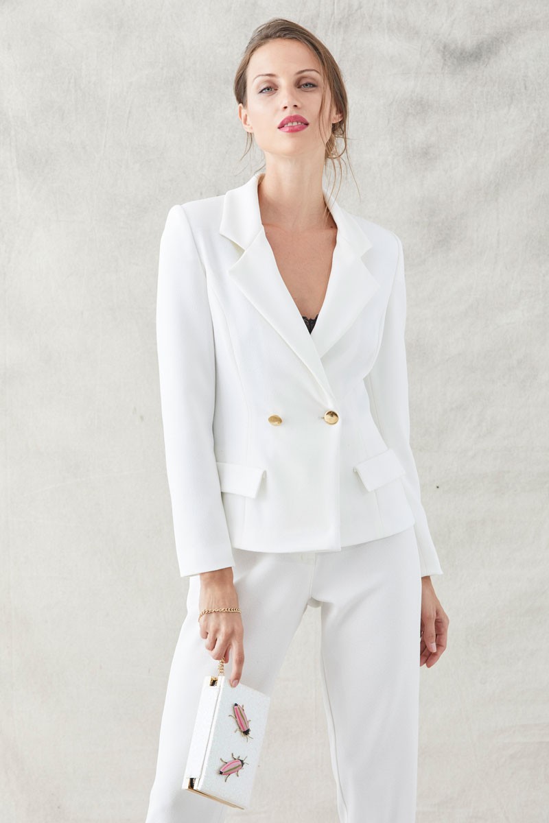 Bolso de mano rectangular, con base blanca de purpurina irisada que refleja en tonos rosas, morados y ligeramente verdosos y azules. Figura de dos insectos joya en tonos rosas, verdes y dorados. (...)
