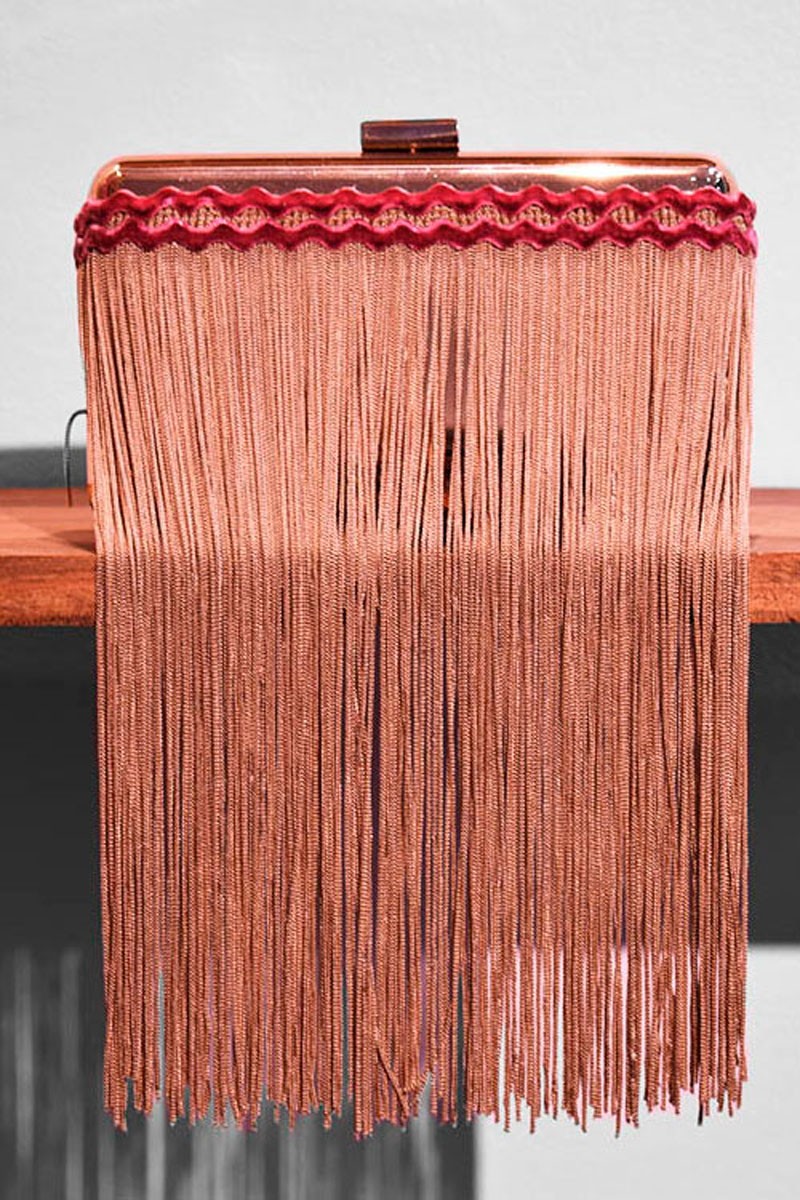 Bolso de fiesta con base de latón dorada. Lleva unas tiras frambuesas de terciopelo haciendo un bella onda y flecos en color camel. (...)