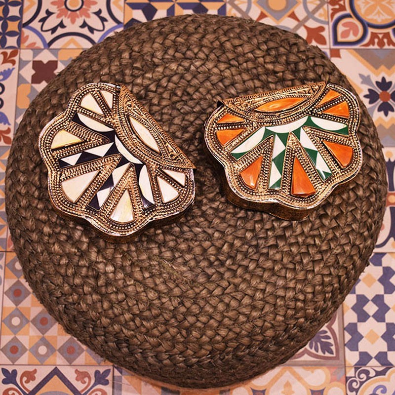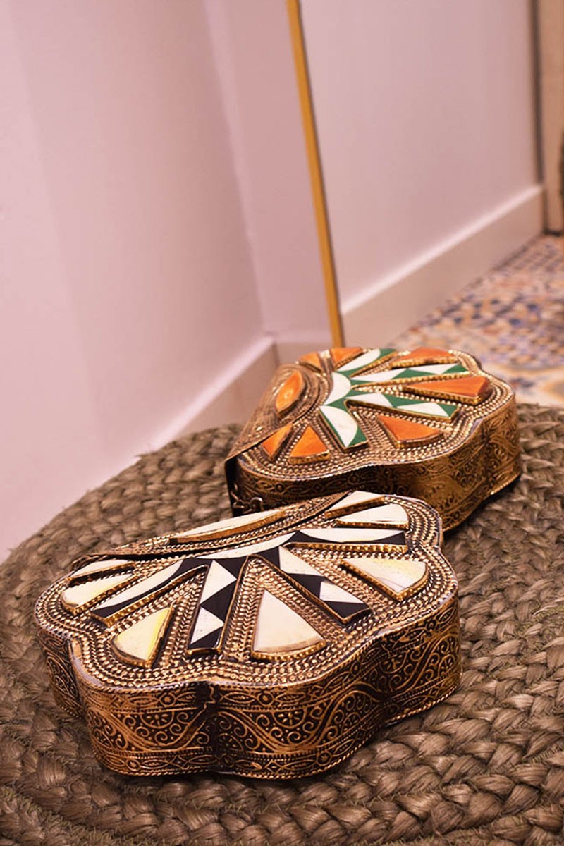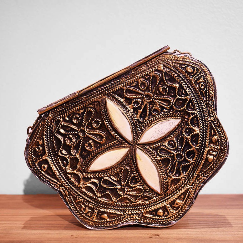 Bolso de fiesta con base de latón dorada envejecida labrada con preciosas formas. En este clutch de artesanía marroquí se combinan los colores blancos y negros dentro de (...)