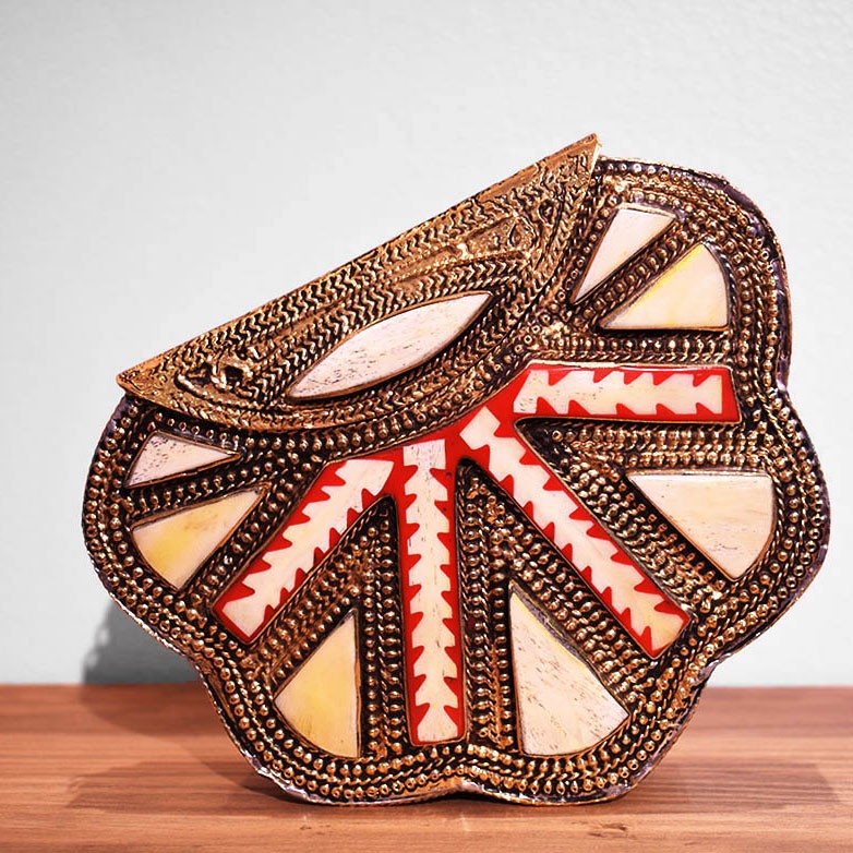 Bolso de fiesta con base de latón dorada envejecida labrada con preciosas formas. En este clutch de artesanía marroquí se combinan los colores blancos y (...)