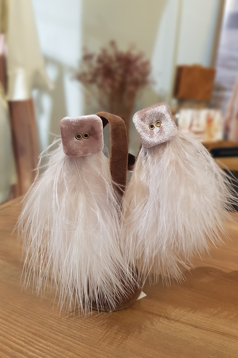 Pendientes con preciosa aplicación con diseño cuadrado de terciopelo rosa palo con detalles dorados en el centro, de los que cuelgan unas bonitas plumas en color blanco. Cierre a (...)
