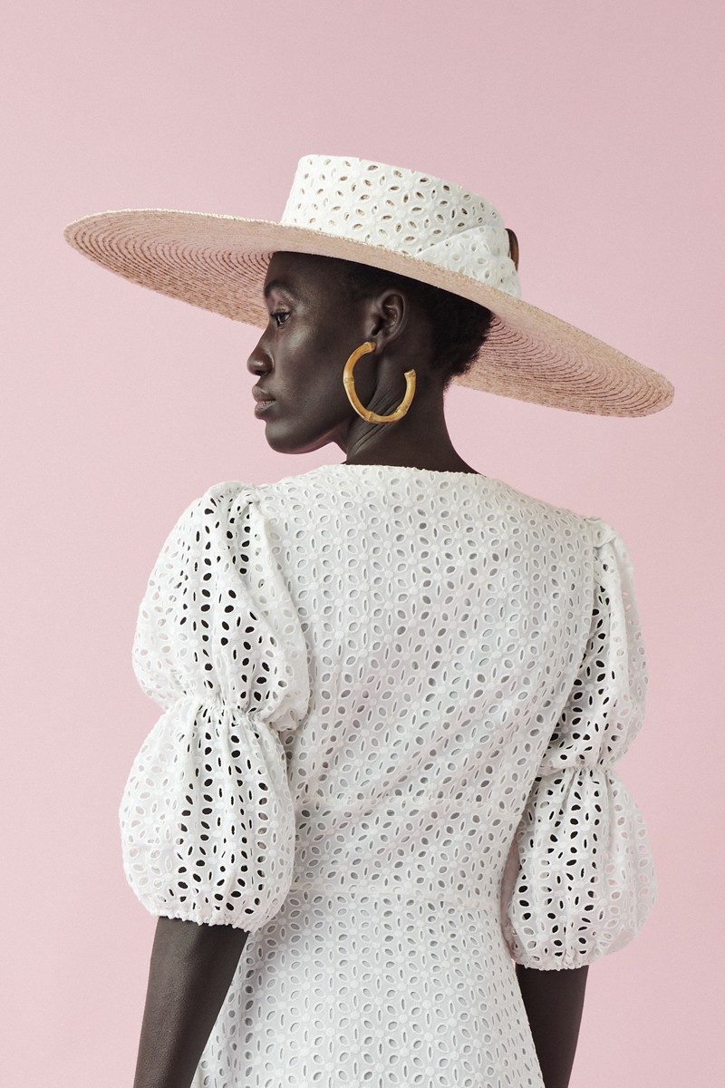 Pamela en rafia natural de gran ala con copa recta adornada por una cinta ancha confeccionada de tejido troqueado blanco con hebilla. (...)