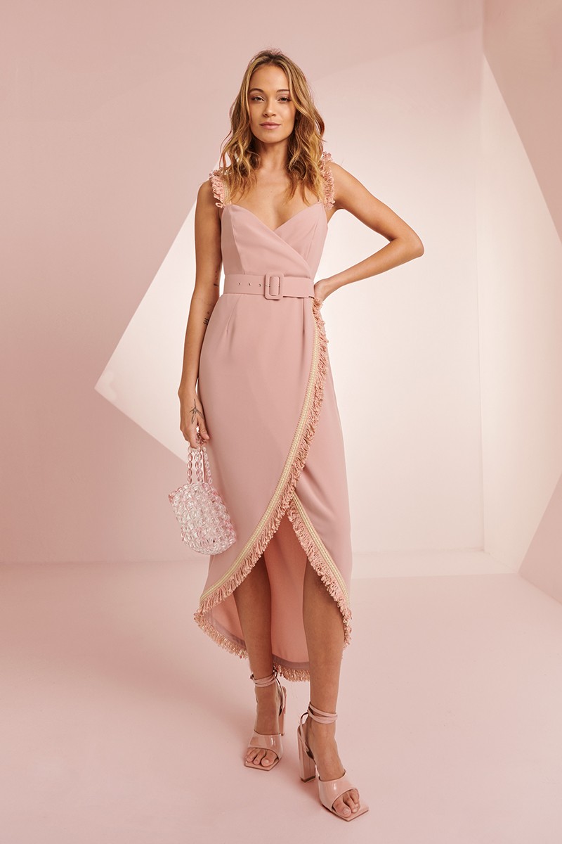 Precioso cinturón forrado en crepe rosa con hebilla en el centro y botones para ajustarlo a la cintura acabado en pico. (...)
