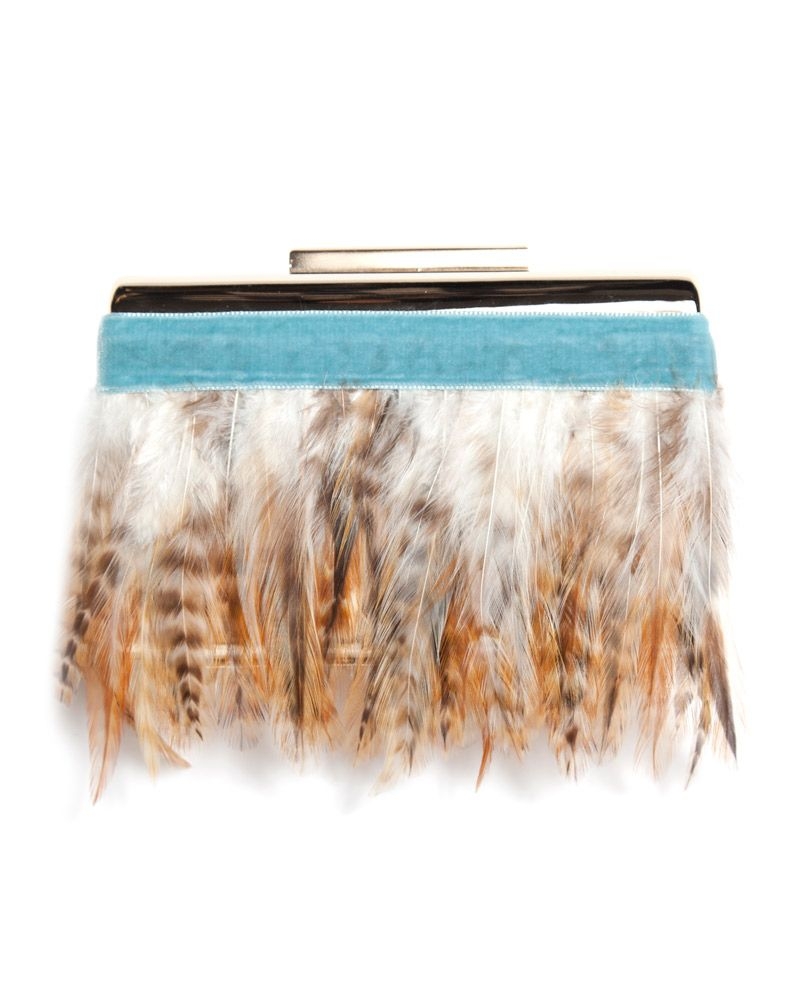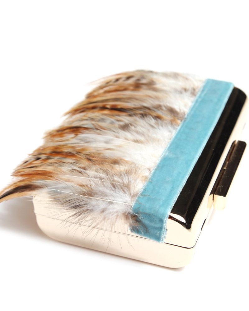 Clutch de fiesta con base dorada. Diseño con cintas de terciopelo azul claro y plumas en tonos beige. (...)