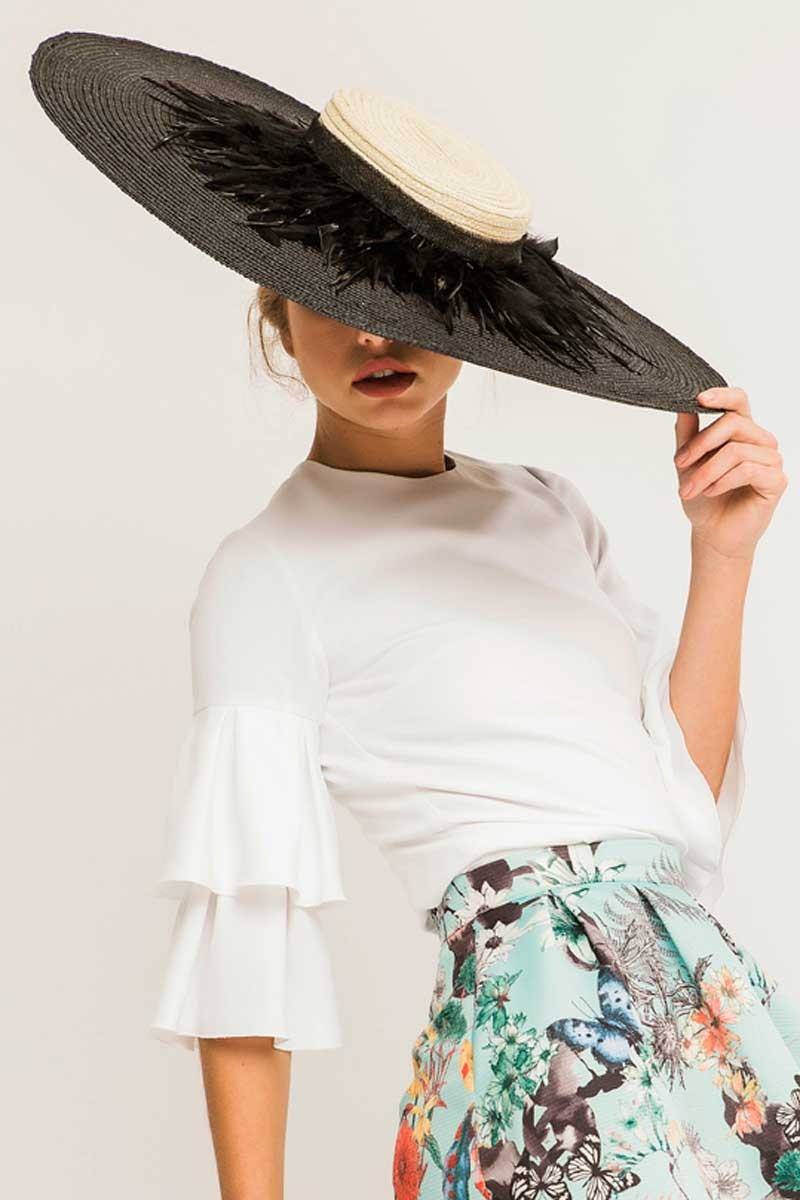Espectacular pamela de rafia natural negra con plumas negras y cinta a juego. (...)