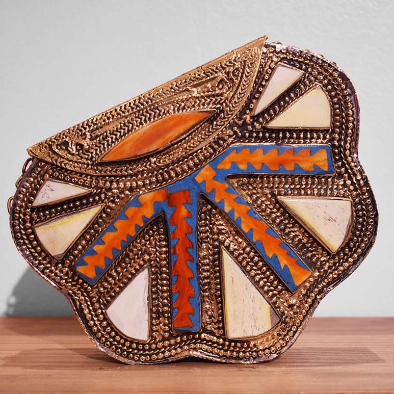 Bolso de fiesta con base de latón dorada envejecida labrada con preciosas formas. En este clutch de artesanía marroquí se combinan los colores blancos, naranjas y azules (...)