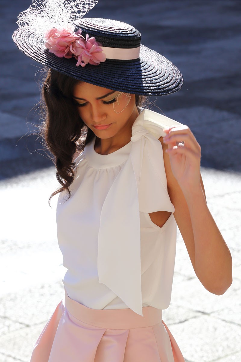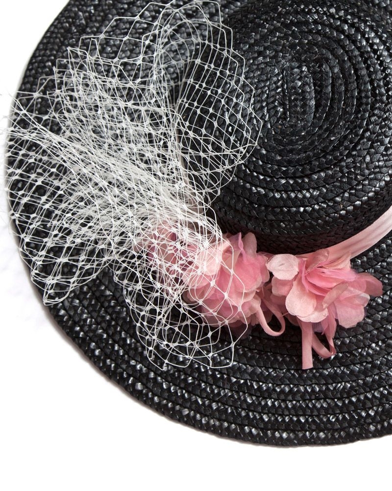Canotier de rafia negro con cinta y flores en color rosa y redecilla en color blanco. (...)