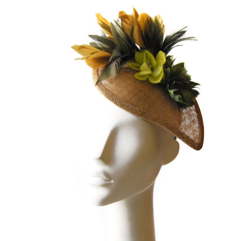 Tocado con base de sinamay, flores de seda hechas a mano en tonos verdes y plumas de gallo entonados. Montado sobre diadema metálica forrada de sedón (...)