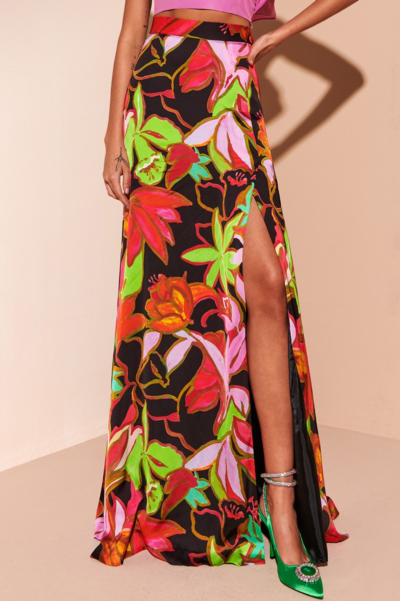 Espectacular falda larga de crep satén con en negro estampado de flores en rosa, naranja, verde, lila... (...)