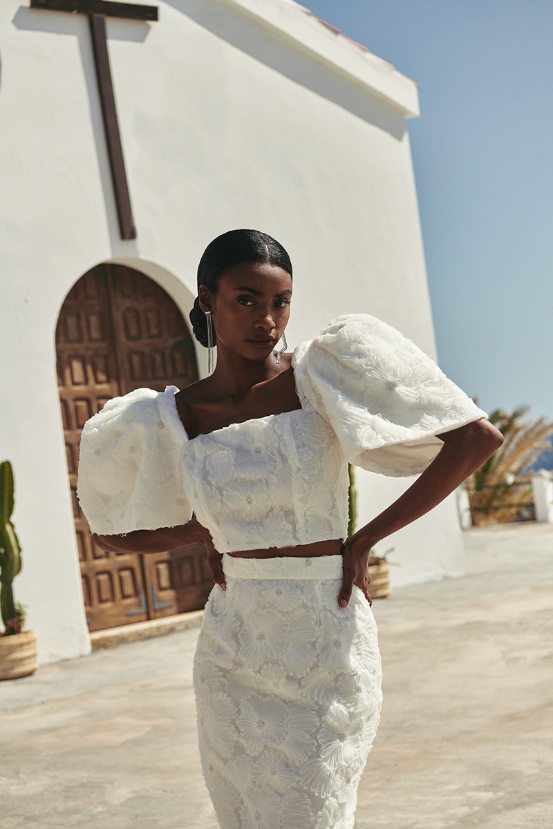 Preciosa falda joya confeccionada en tul fantasía con flores bordadas en relieve y pailletes color blanco de gran calidad. (...)