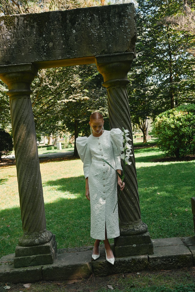 Precioso vestido confeccionado en un jacquard blanco con dibujo floral en relieve de excelente calidad, destaca por su manga abullonada con volumen. (...)