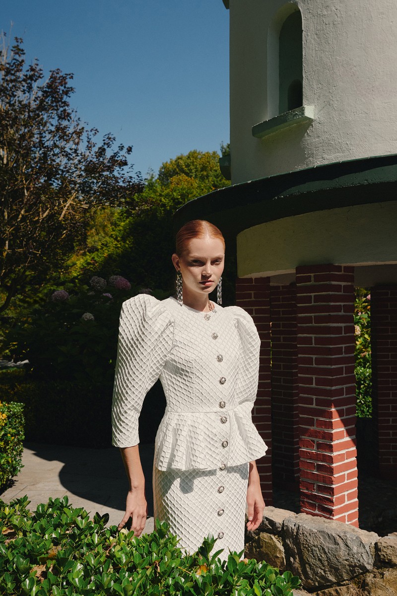 Precioso vestido confeccionado en jacquard brocado blanco con dibujo geométrico de rombos. (...)