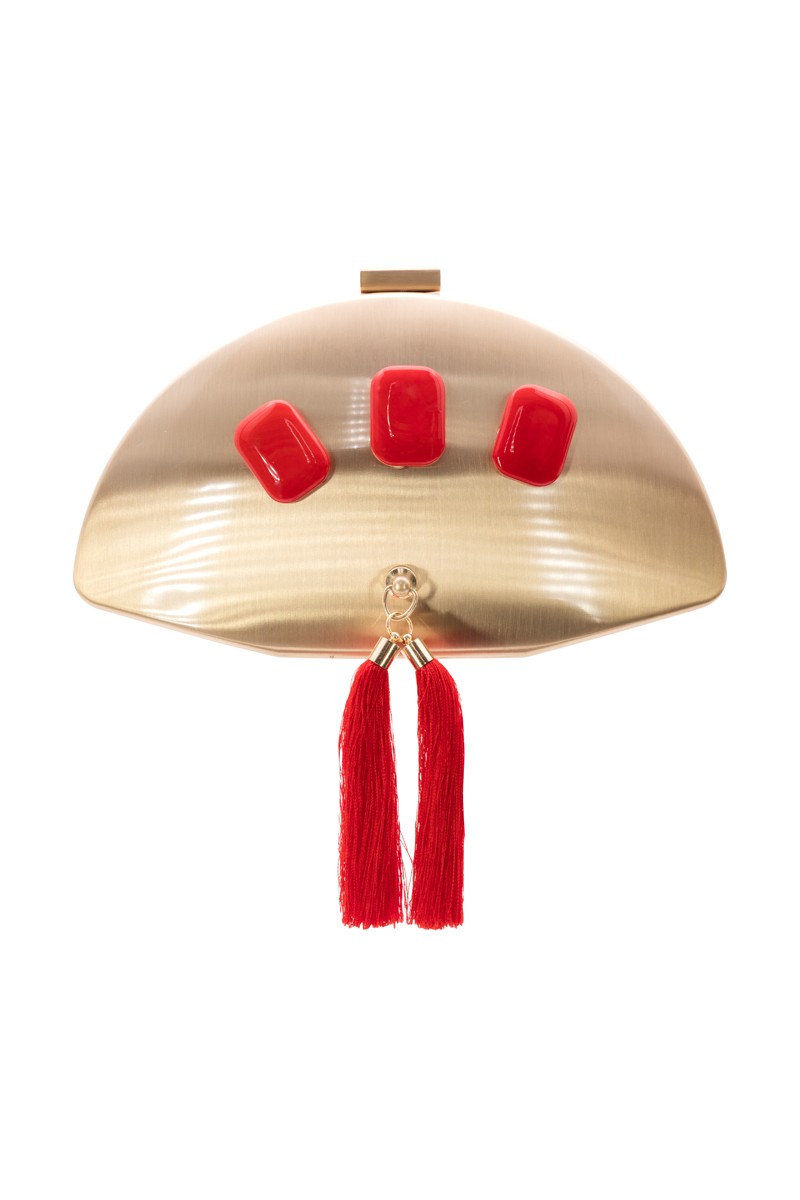 Ideal bolso de fiesta con base dorada mate en forma de abanico. Adorno de 3 piedras planas con detalle de flecos al tono. (...)