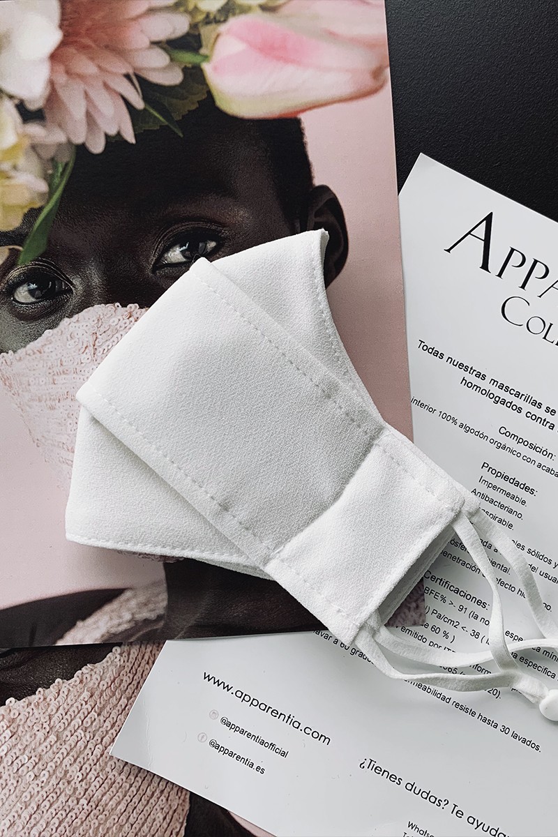 Mascarilla homologada confeccionada en crep blanco. Modelo "3 dimensiones" con pieza horizontal y zona de los ojos más despejada. Gomas laterales ajustables. (...)