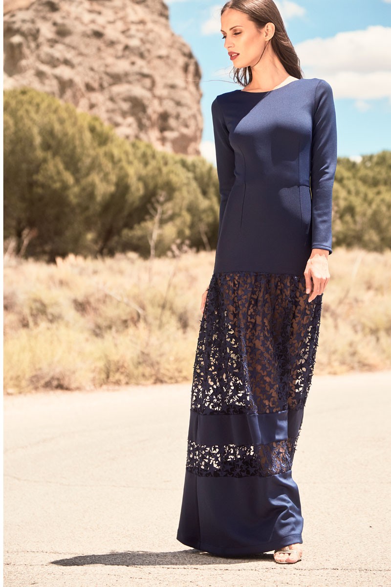 Espectacular vestido de fiesta largo ajustado confeccionado en neopreno azul marino con trasparencias de tul con estrellas bordadas. Cuello a la caja, manga larga y espalda cerrada. Forro interior y (...)