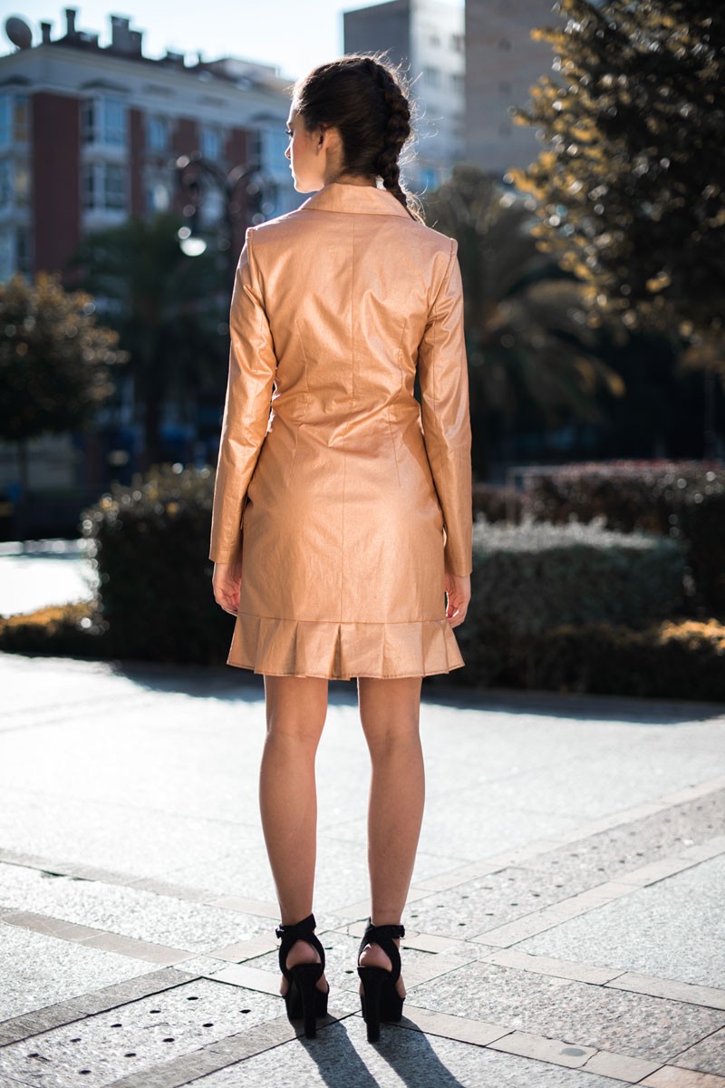 Vestido corto tipo esmoquin confeccionado en tejido de algodón encerado en color oro tostado rosa. Corte entallado que estiliza y favorece la figura femenina. Un precioso vestido en un (...)