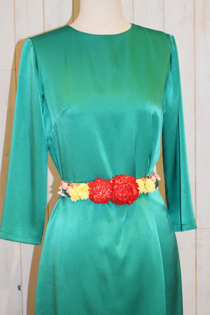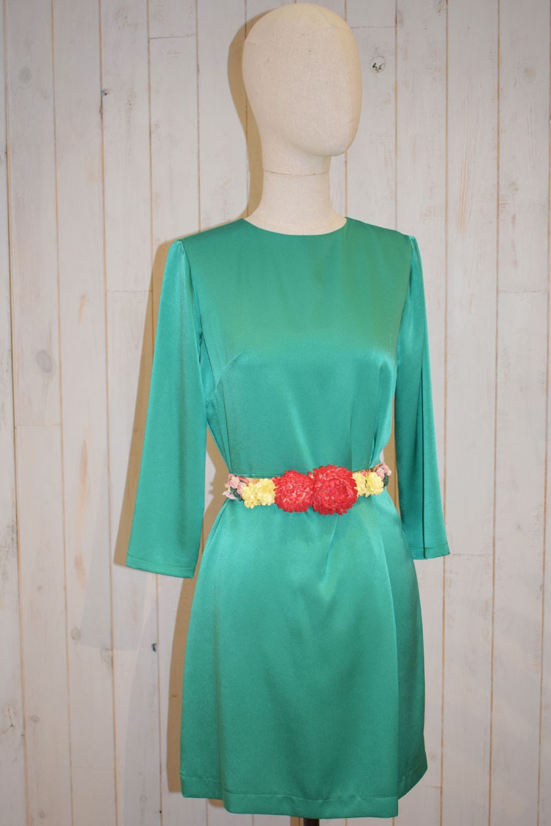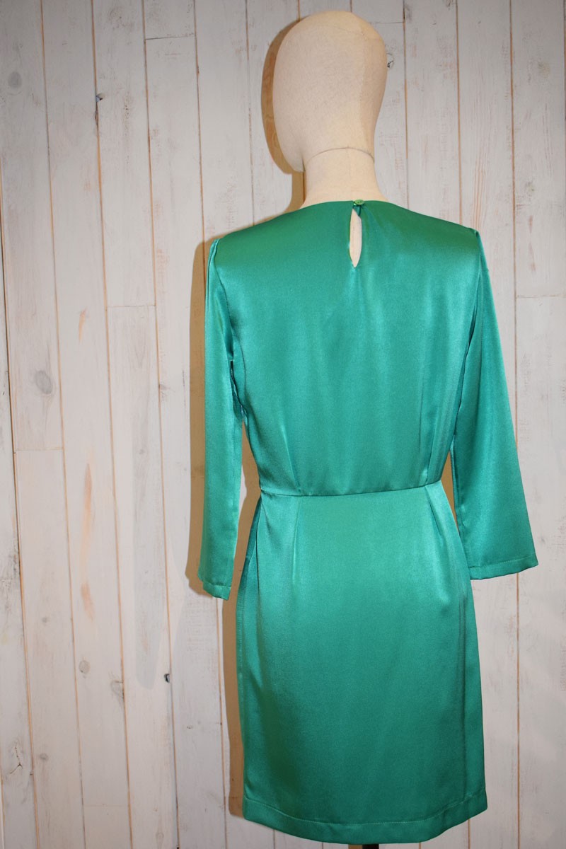 Precioso vestido de fiesta largo confeccionado en satén color verde de manga larga y cuerpo cerrado en la parte delantera y con bonito escote en la espalda. (...)