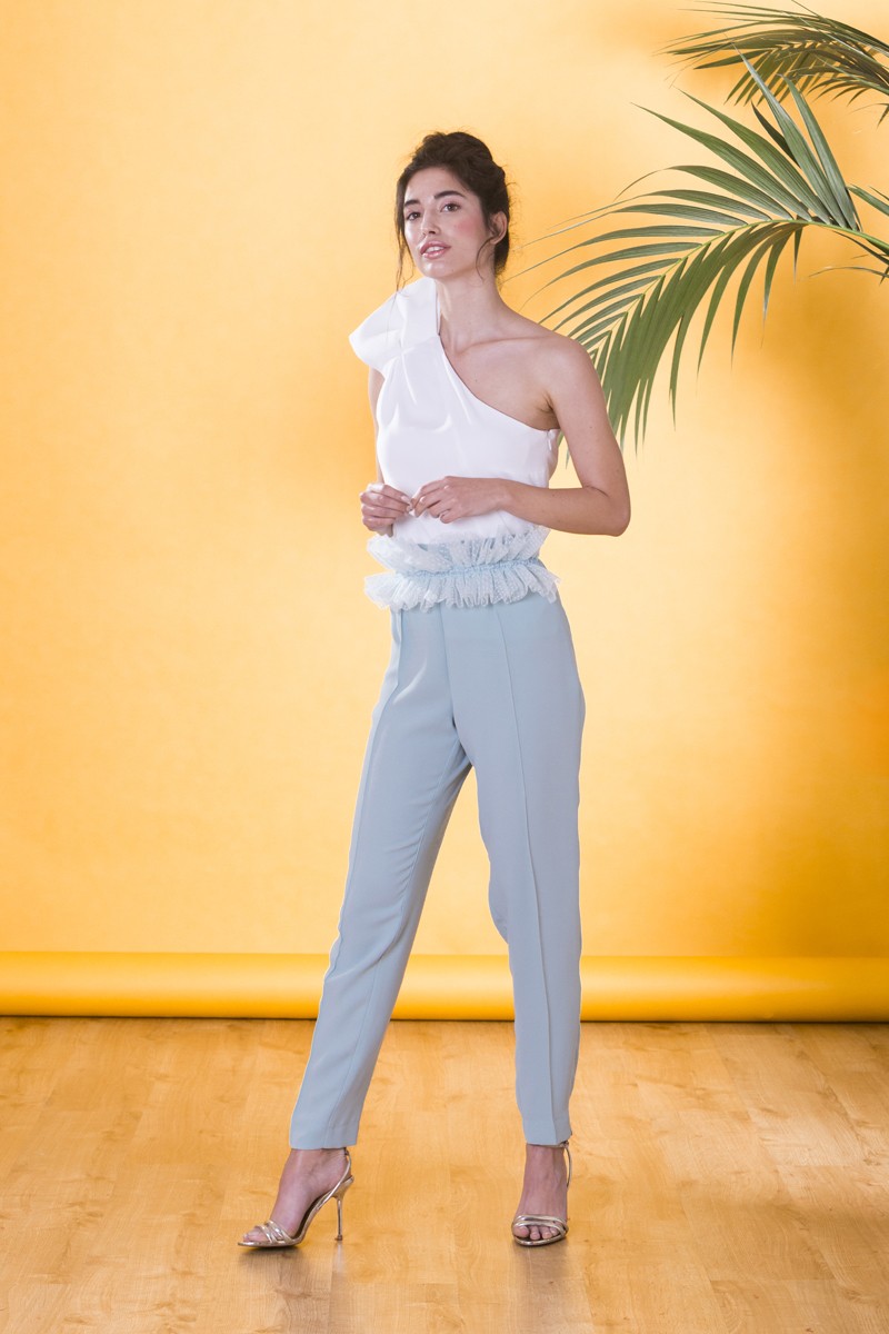 Pantalón pitillo confeccionado en tejido de crepe de color Verde Agua. Ceñido en la cintura, estiliza la figura femenina y con detalle en la cinturilla de (...)