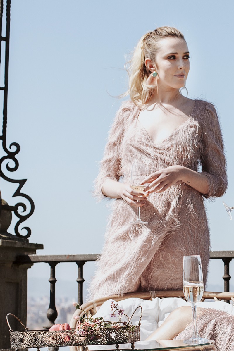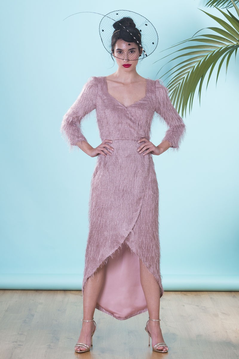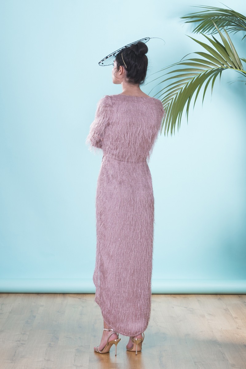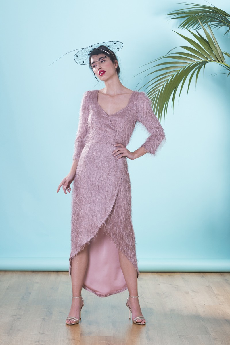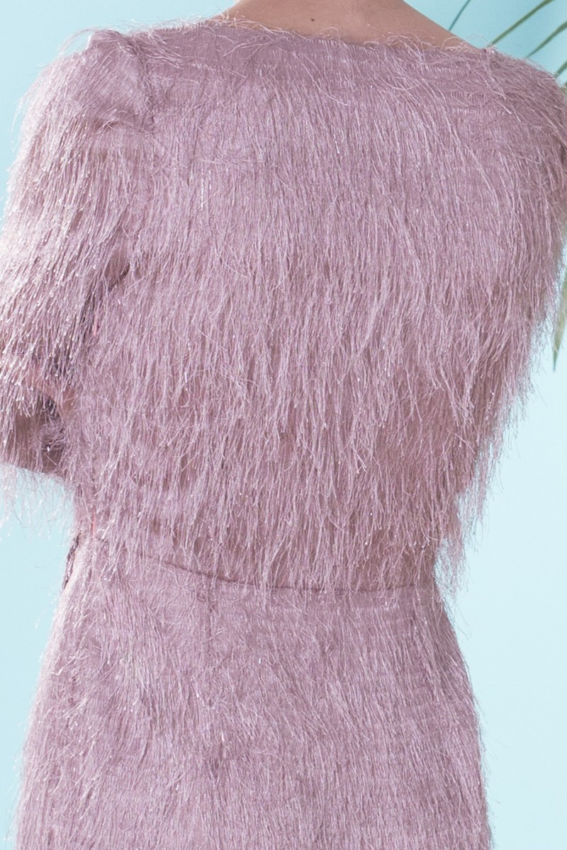 Precioso vestido midi confeccionado en tejido de flecos cortos finos color rosa palo con brillo metálico de excelente calidad, con manga larga y ajustado en la cintura. Escote en pico (...)