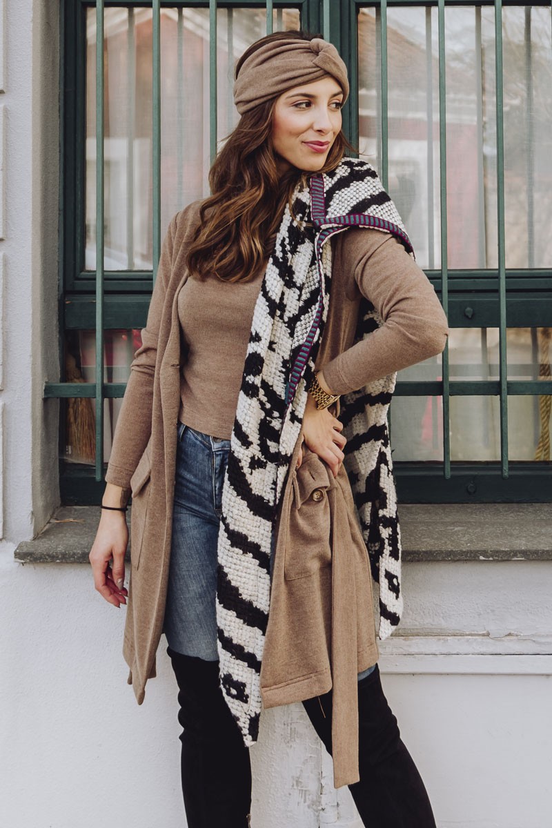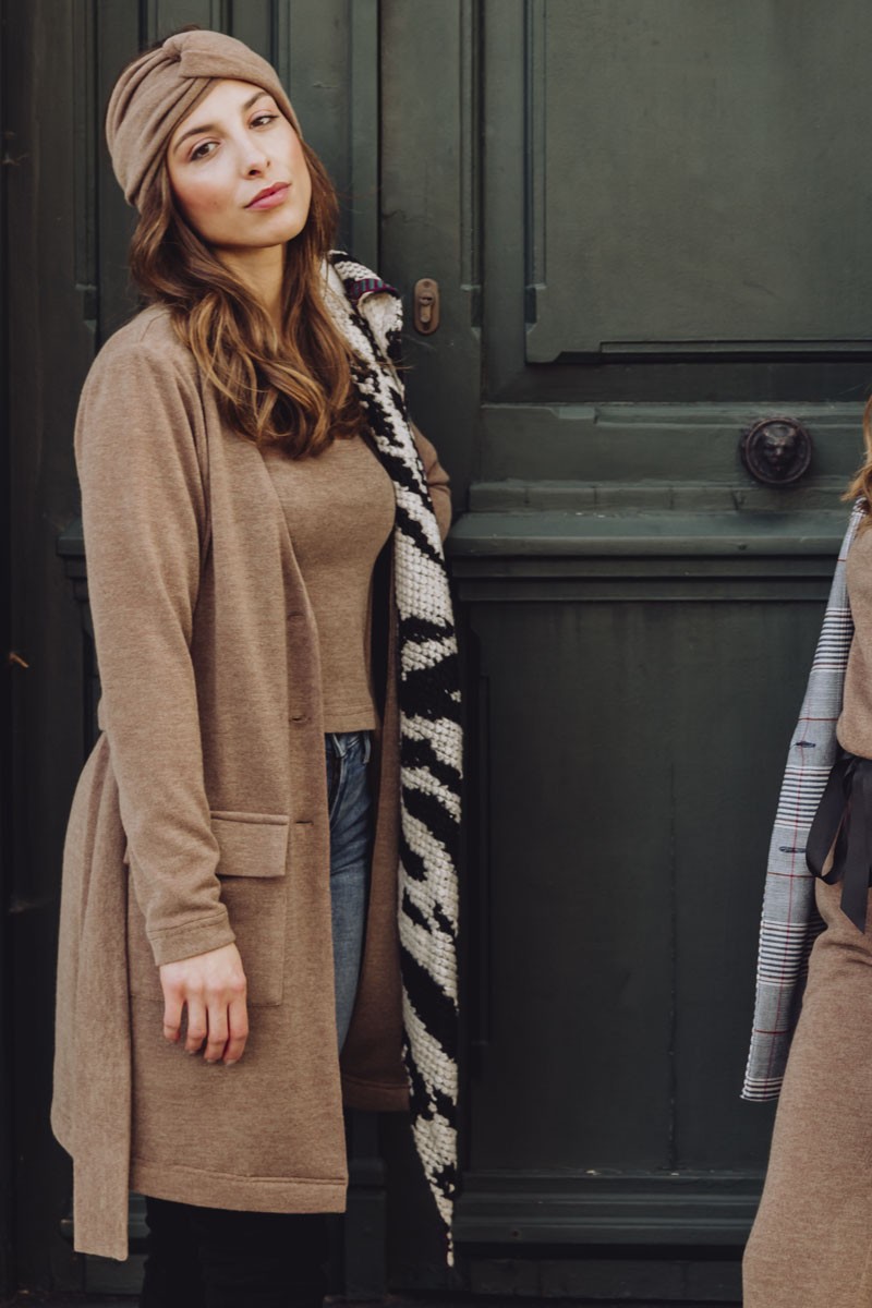 Conjunto confeccionado en punto marrón formado por top de tirantes con largo por debajo de la cintura y chaqueta de botones con escote en pico. (...)
