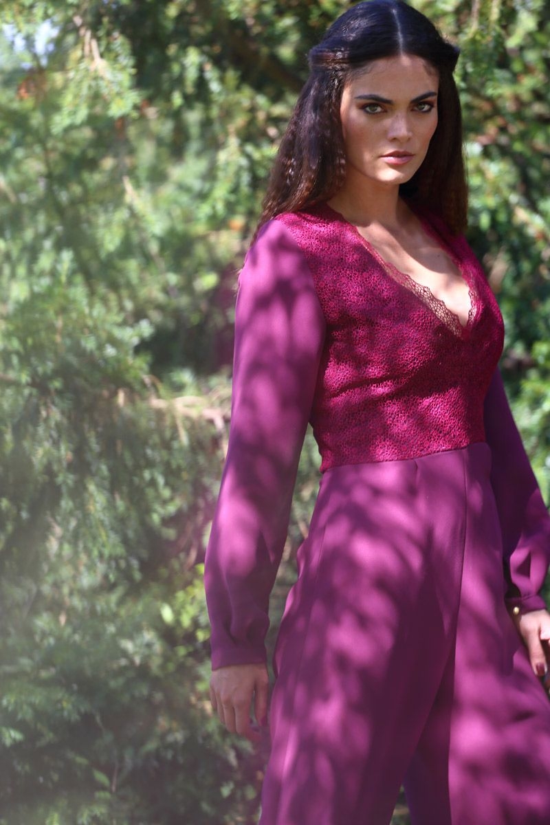 Mono de fiesta confeccionado en crepe marsala. El cuerpo superior está realizado en guipur. Diseño de pernera ancha, manga larga con cierre de botones dorados en los puños y (...)