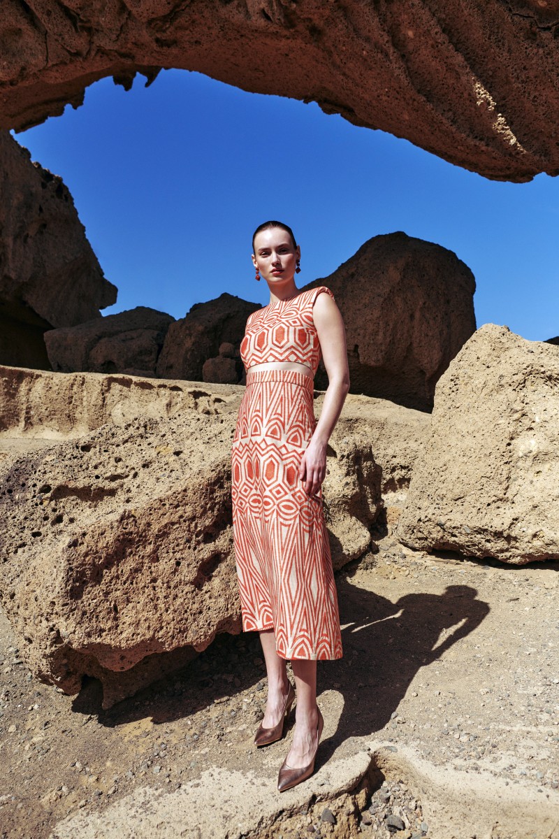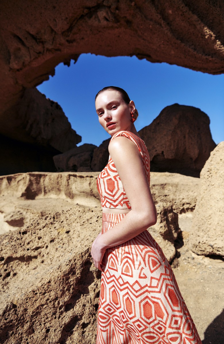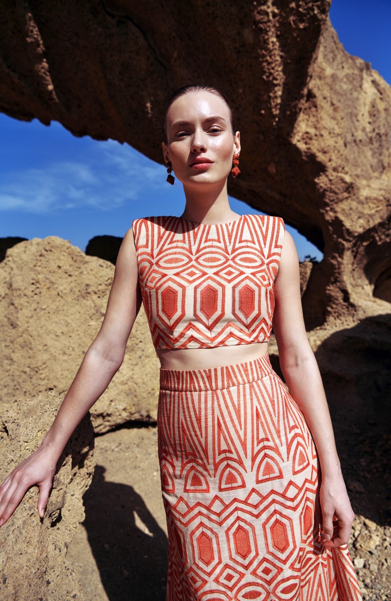 Precioso top corto confeccionado en un precioso lino bordado con estampado ´étnico en tonos beige y naranja. Cremallera metálica dorada en la espalda. (...)
