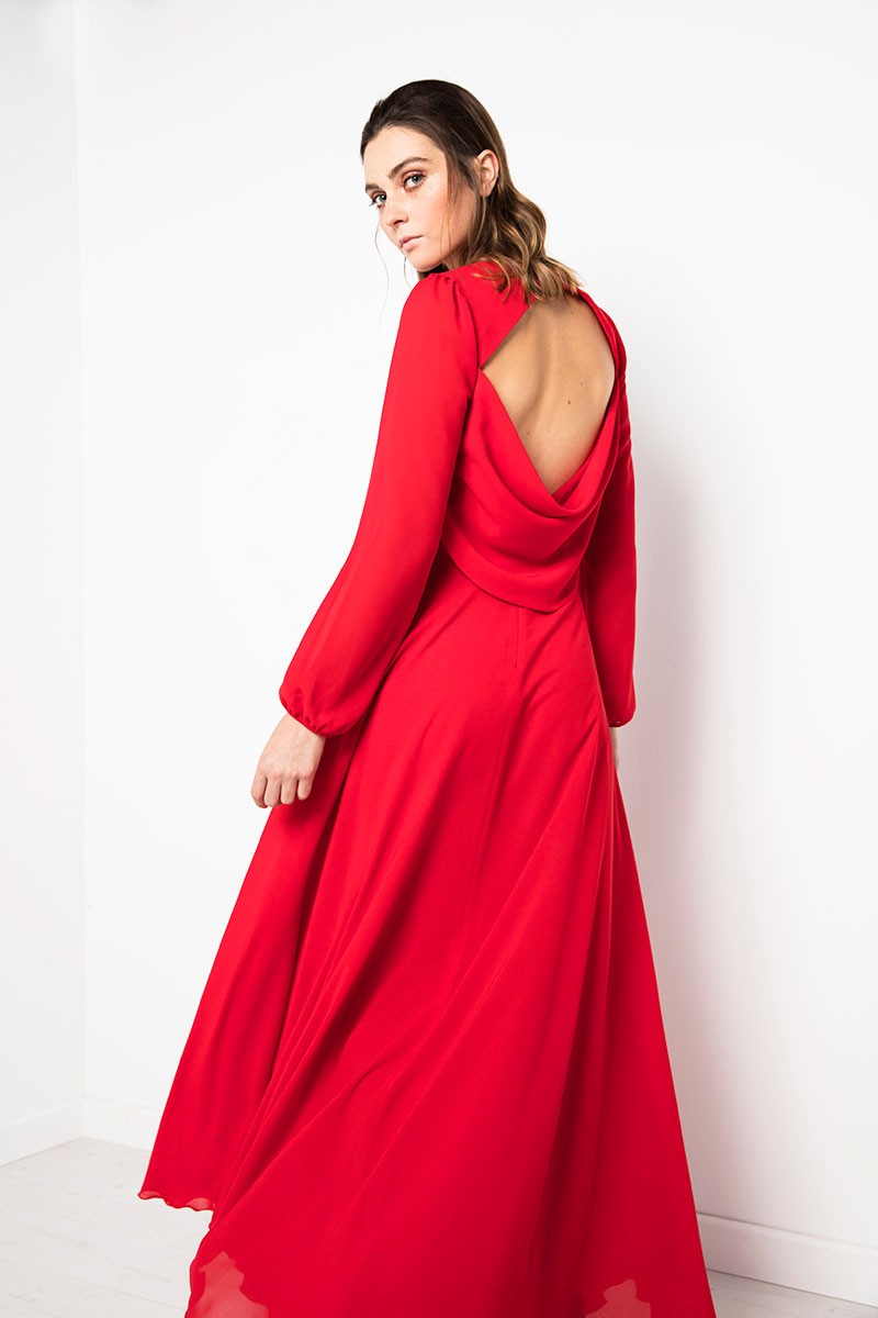 Vestido largo en colo rojo realizado en gasa chiffon con espalda abierta y pieza drapeada. (...)