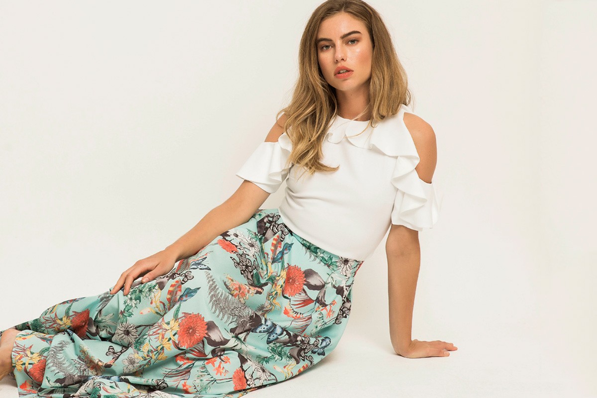 Falda larga de vuelo confeccionada en crepe satén, de color azul celeste con estampado de flores y mariposas. Forro interior. Cierre en la parte trasera con cremallera al tono y doble (...)
