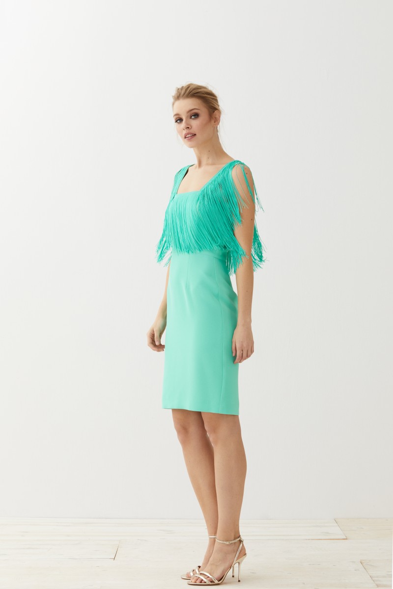 Vestido corto recto confeccionado en crepe de color aguamarina con flecos. (...)