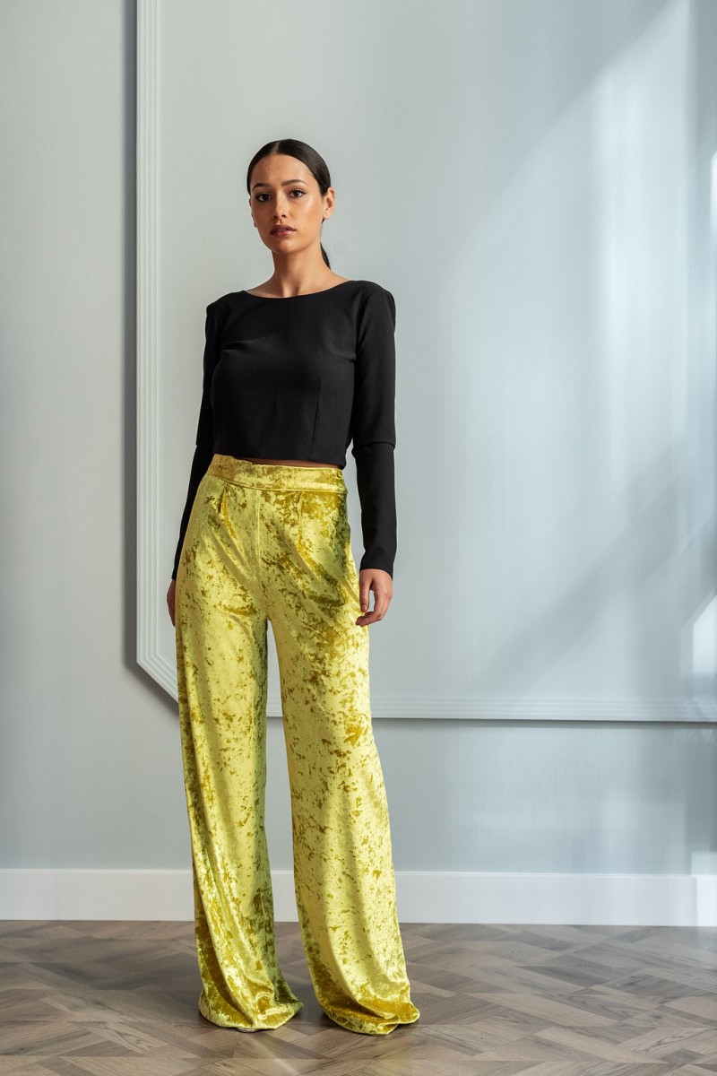 Pantalón palazzo confeccionado en terciopelo de color mostaza brillante. (...)