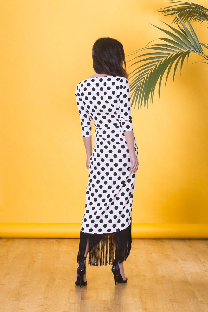 Precioso vestido midi confeccionado en crepe con un hermoso estampado de lunares bicolor blanco y negro, y con flecos negros en el lateral y en el bajo del vestido. (...)