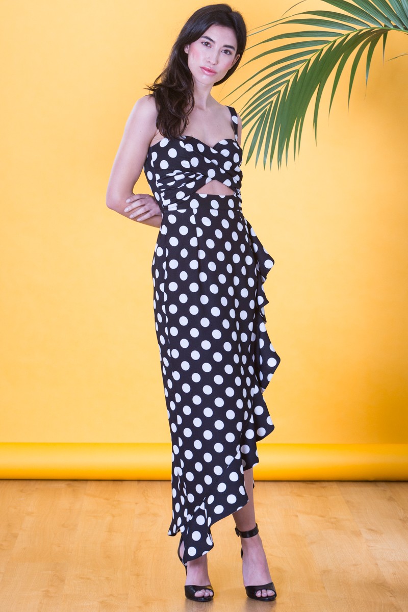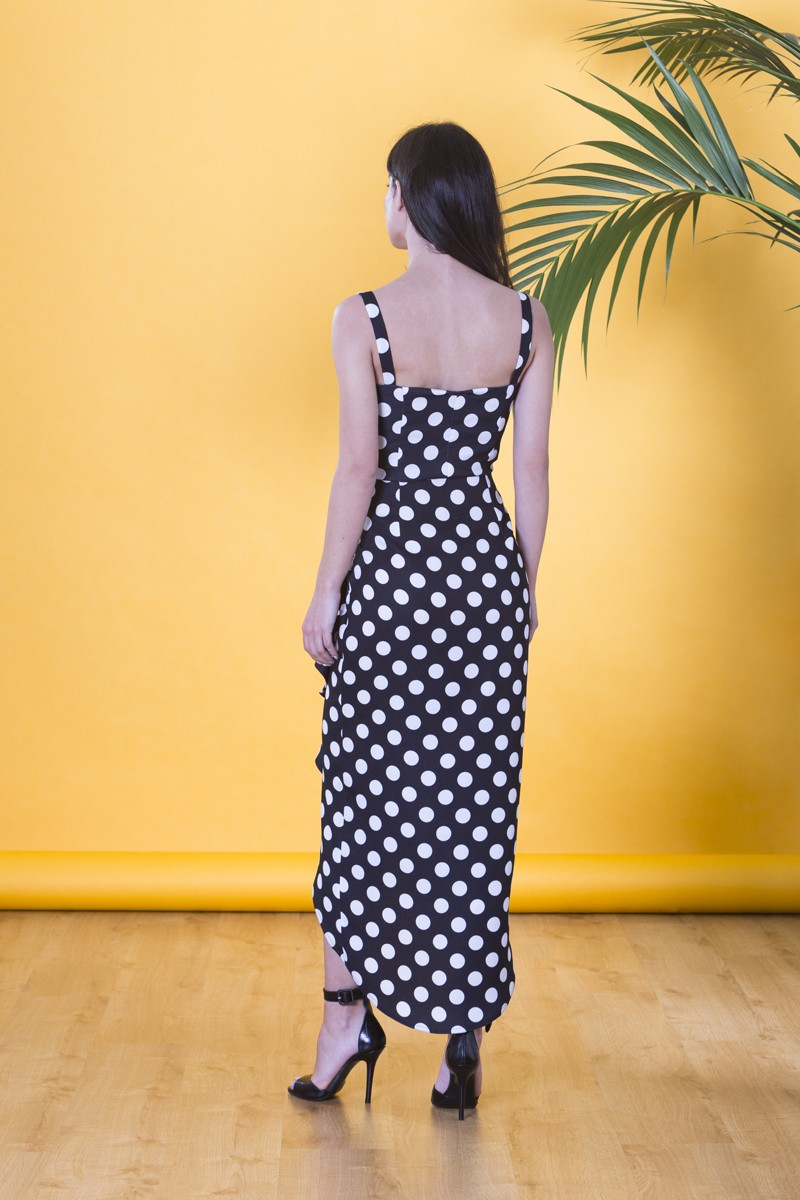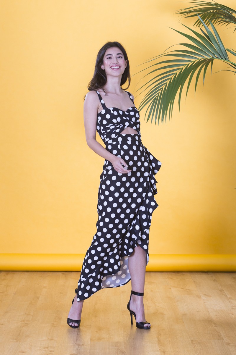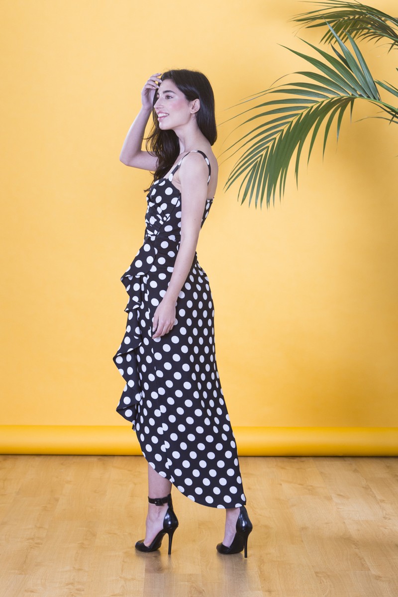 Precioso vestido midi confeccionado en crepe con un hermoso estampado de lunares bicolor blanco y negro, con detalle de volantes en la abertura de la falda. (...)