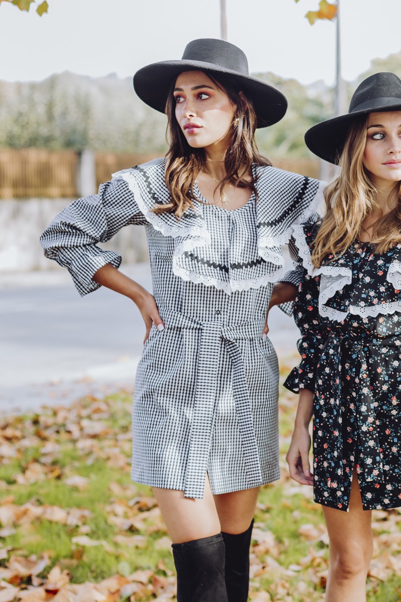 Vestido corto abotonodado con corte de camisa confeccioando en cuadro vichy blanco y negro. (...)