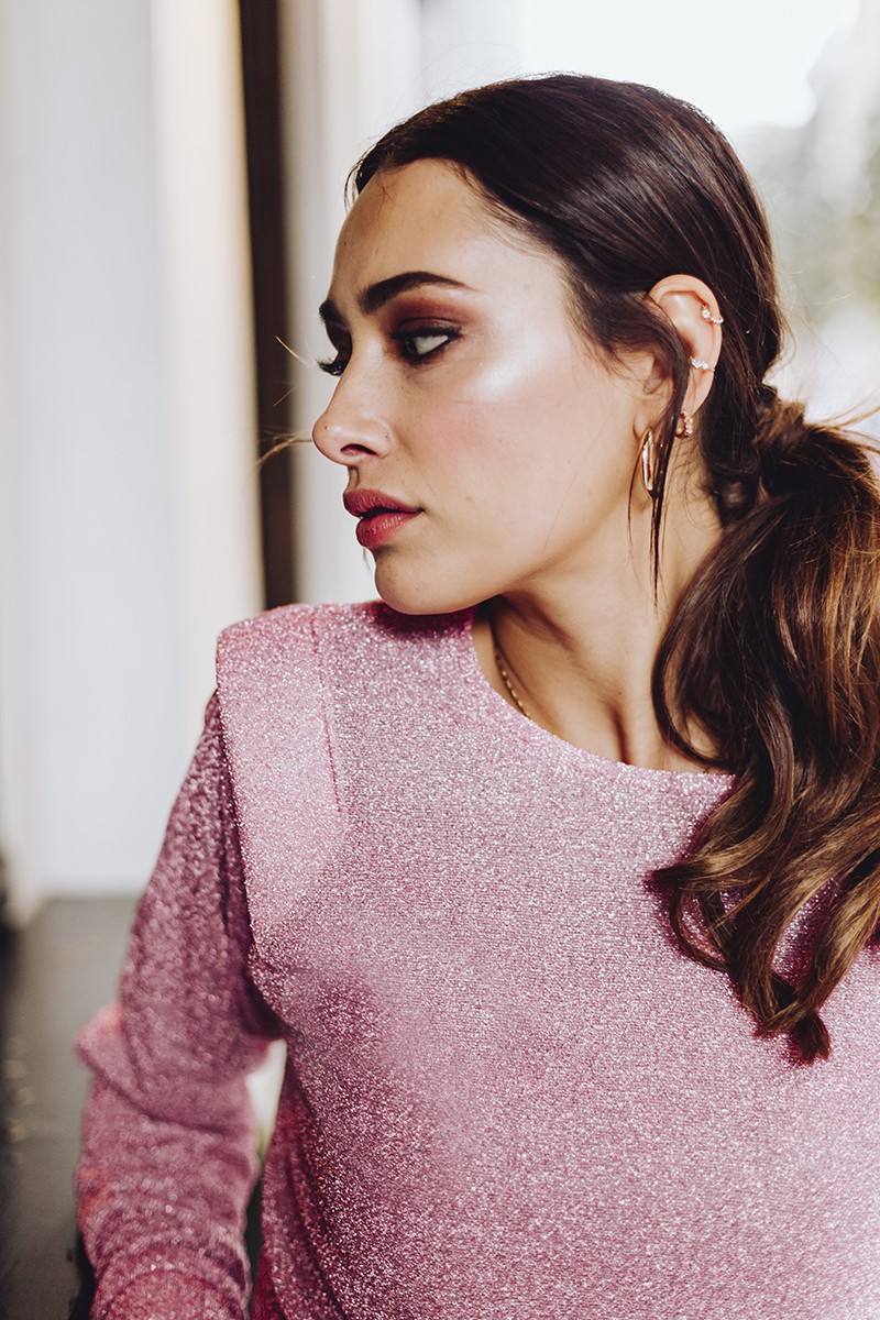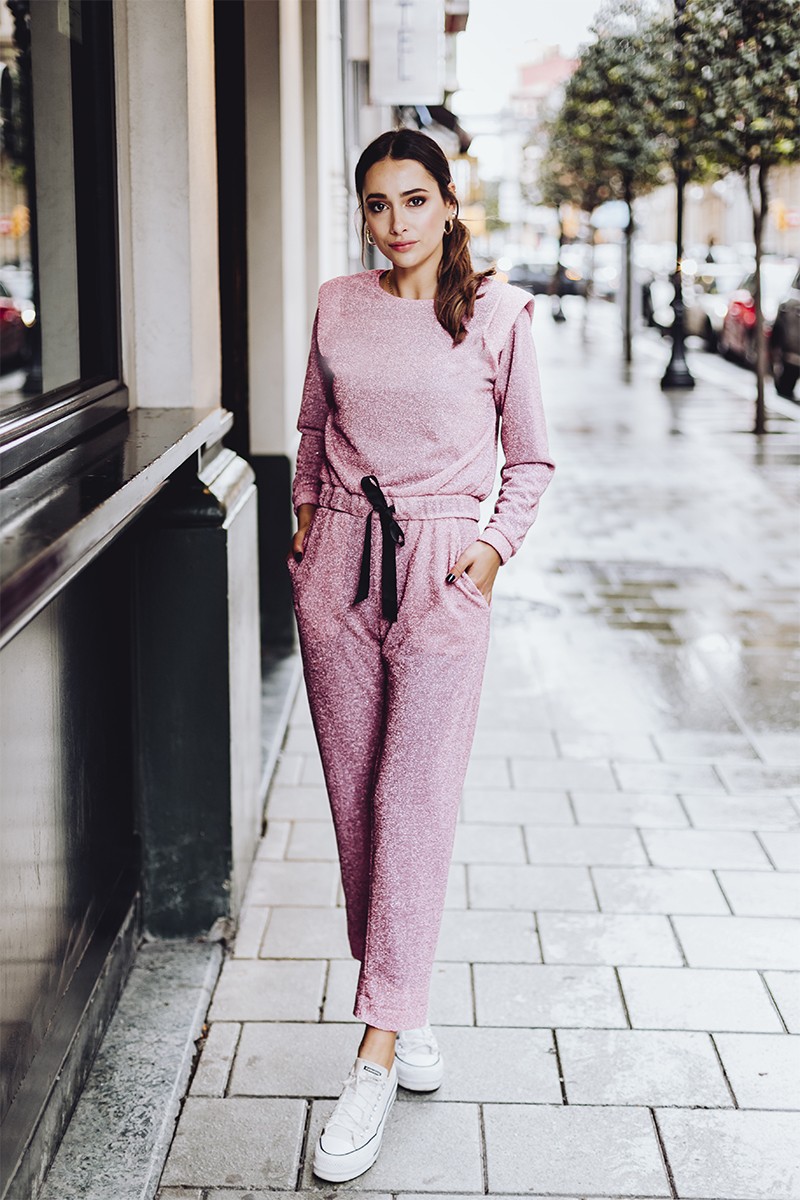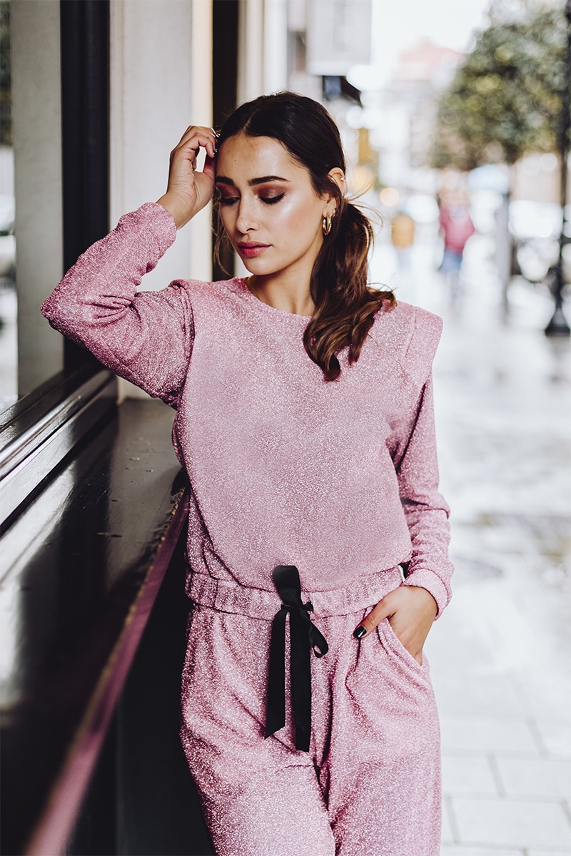 Precioso conjunto de punto lurex confeccionado en color rosa compuesto por pantalón tobillero con goma en la cintura y jersey a juego con hombros marcados con hombrera y goma en cintura con (...)