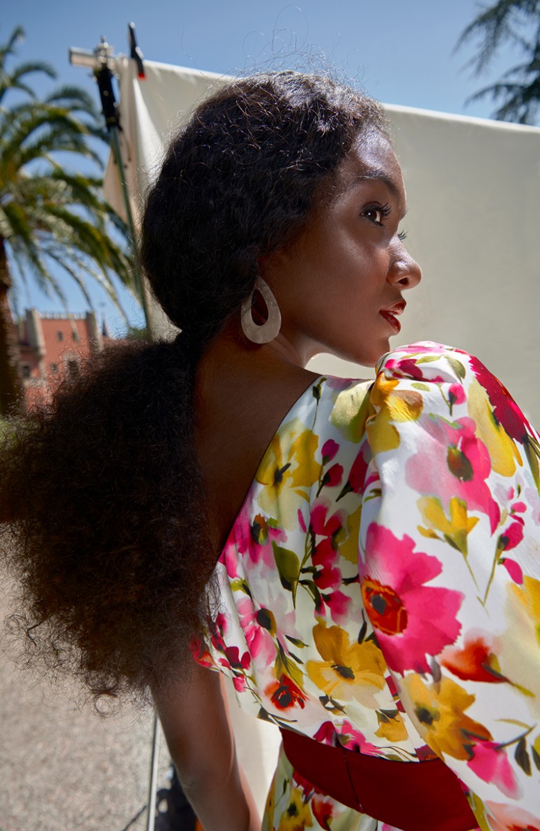 Precioso vestido confeccionado con crep satén con estampadode flores de gran calidad con escote asimétrico y manga abullonada con goma. (...)