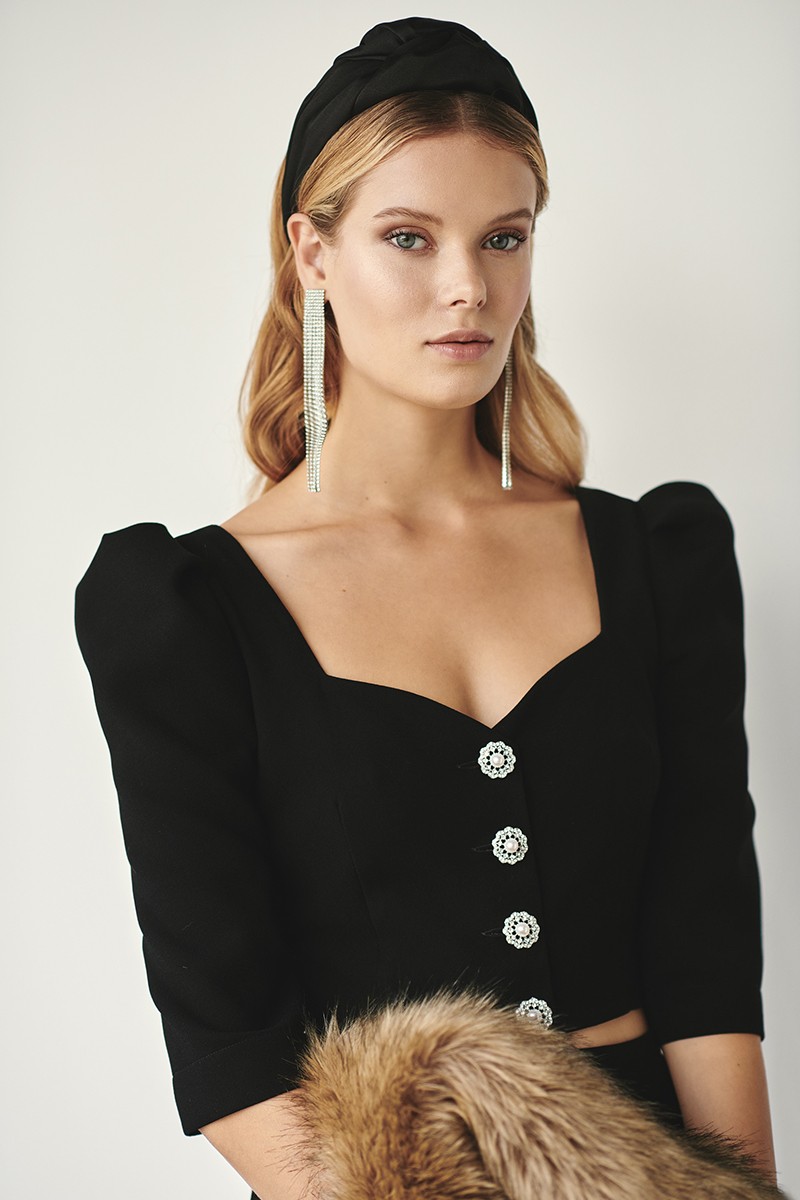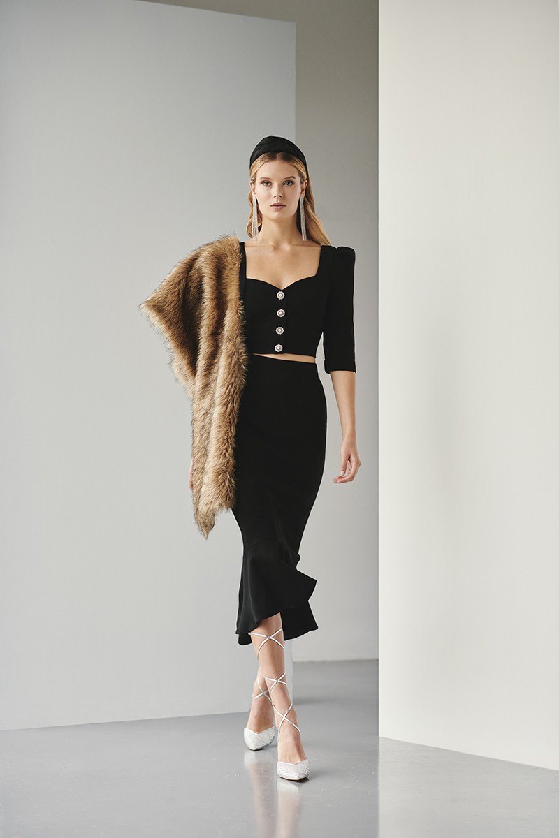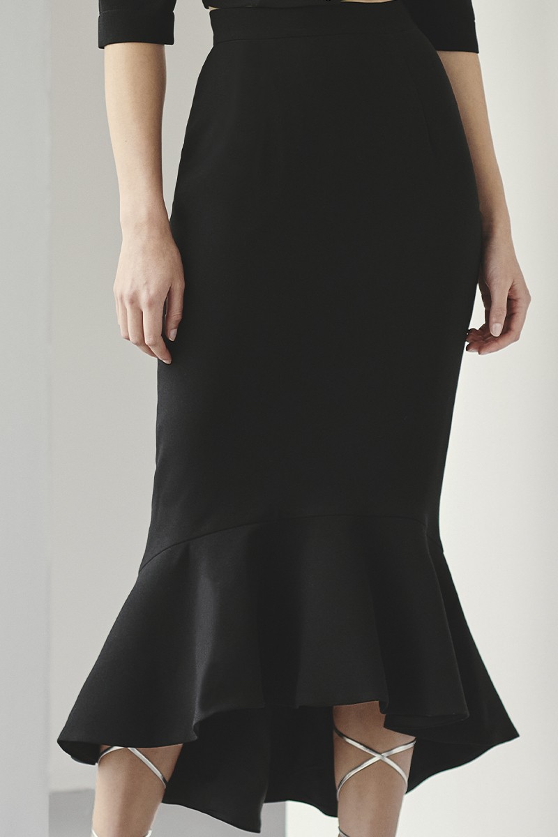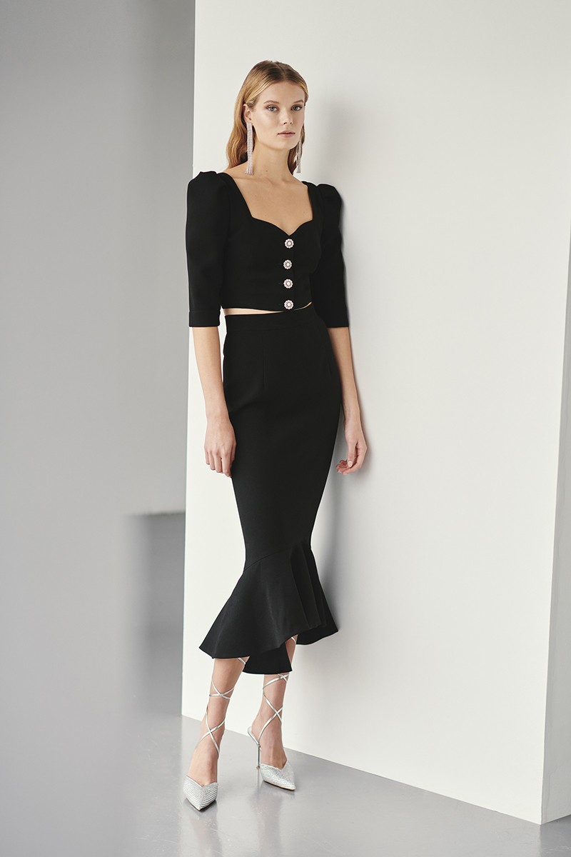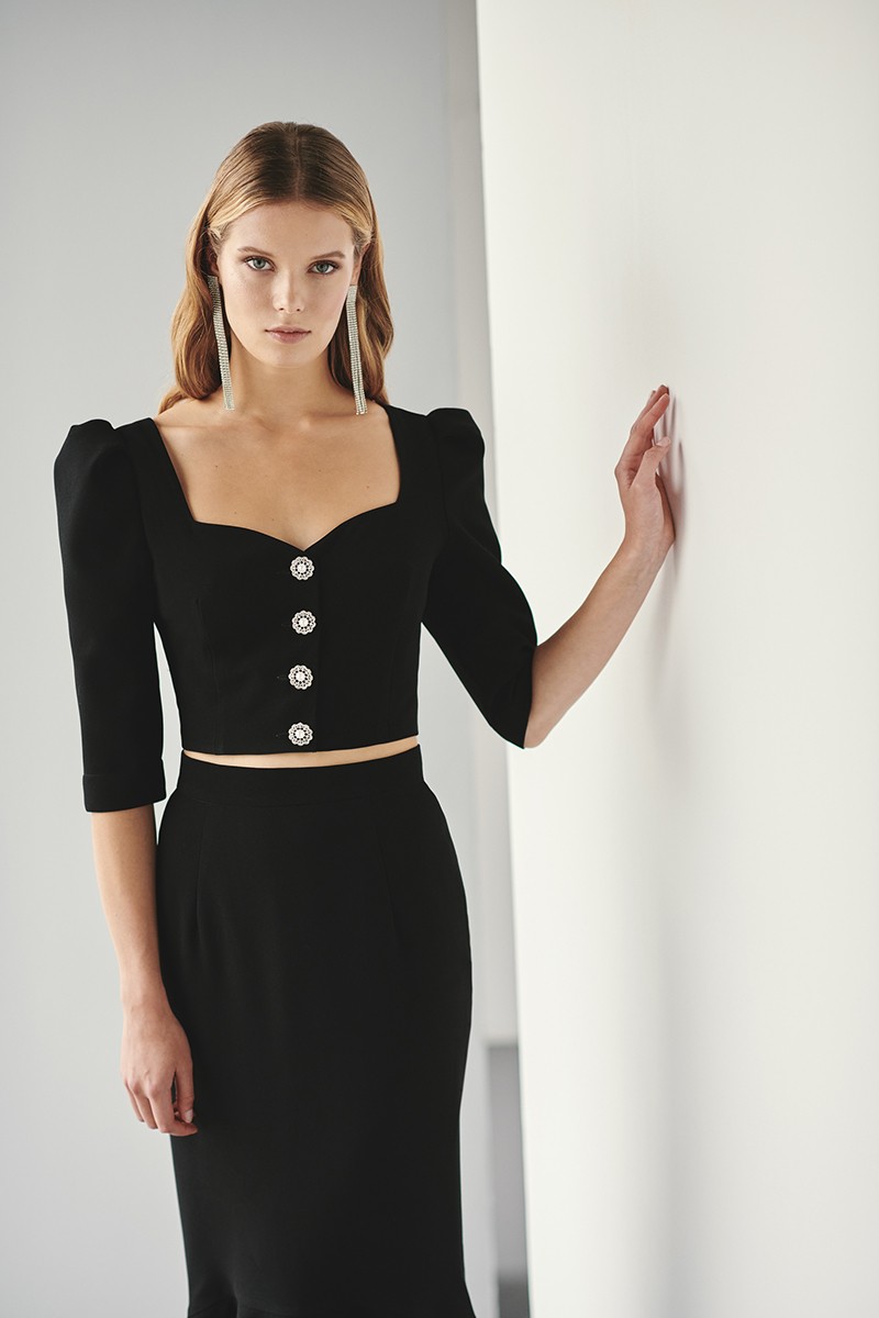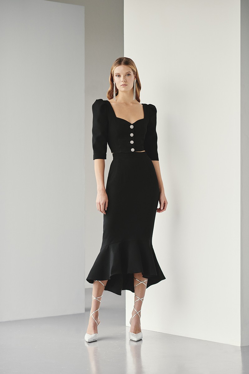 Precioso conjunto de dos piezas de falda y top confeccionado en crepe de alta calidad de color negro. (...)