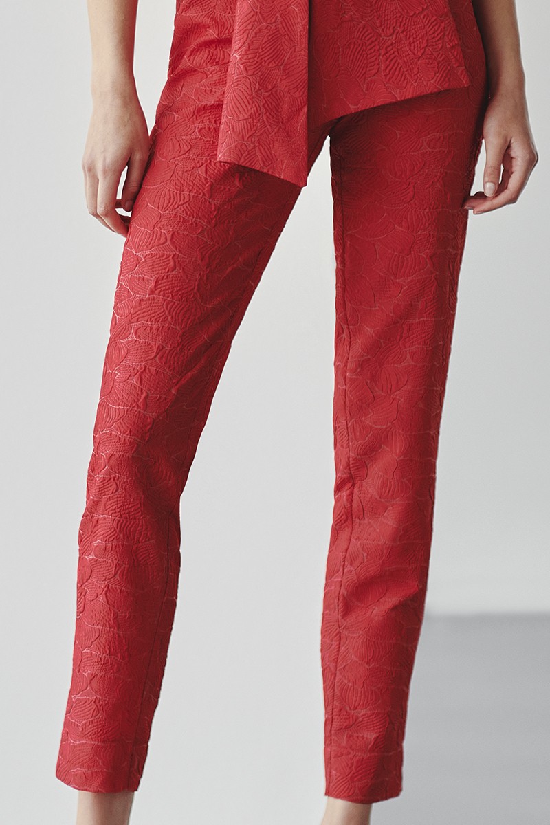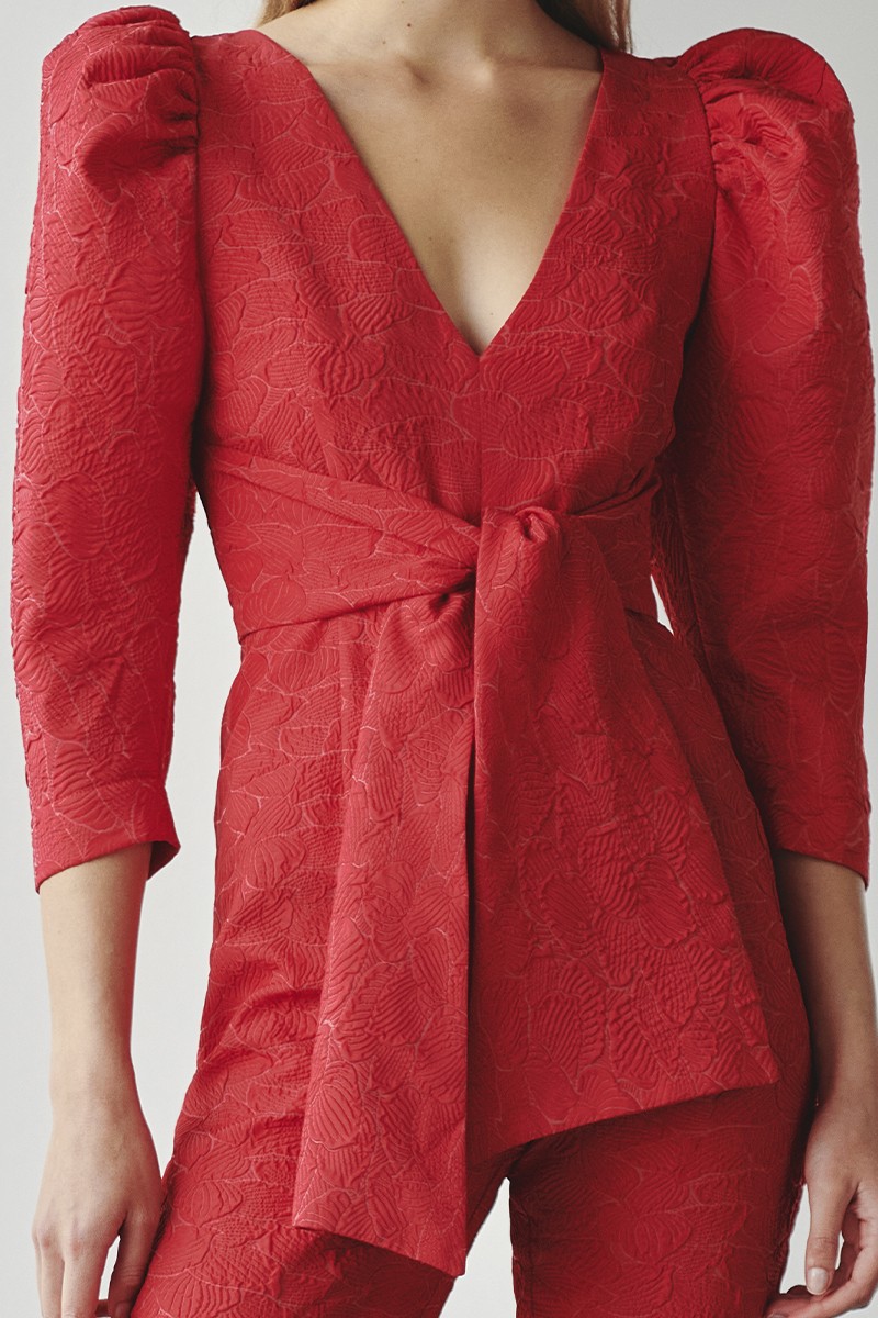 Precioso mono con escote en pico y mangas abullonadas, confeccionadon en un tejido jacquar de gran calidad en color rojo. Lleva lazada para atar en la parte delantera y remarcar la cintura. (...)
