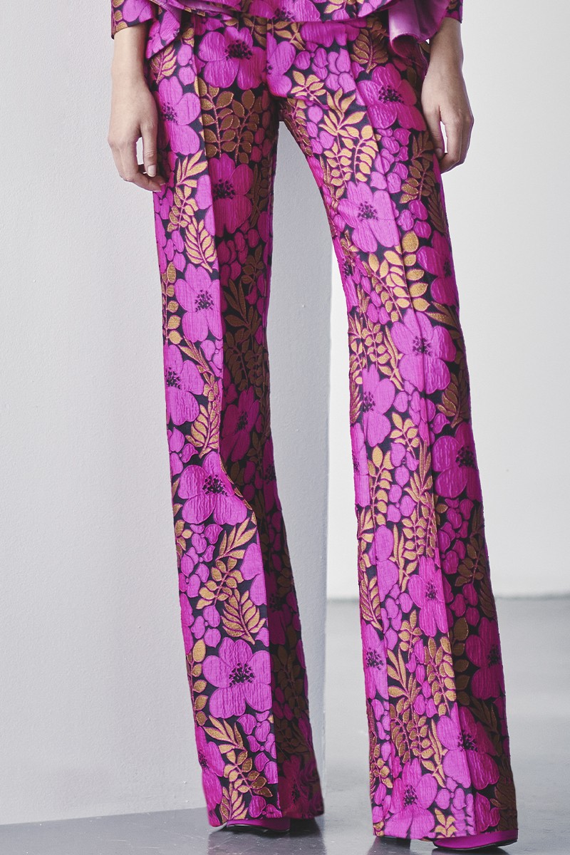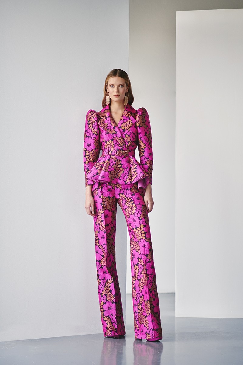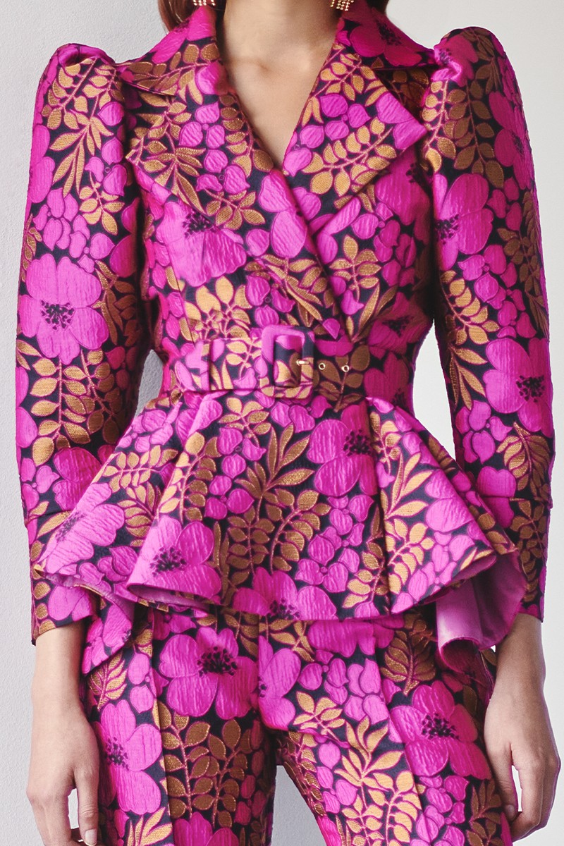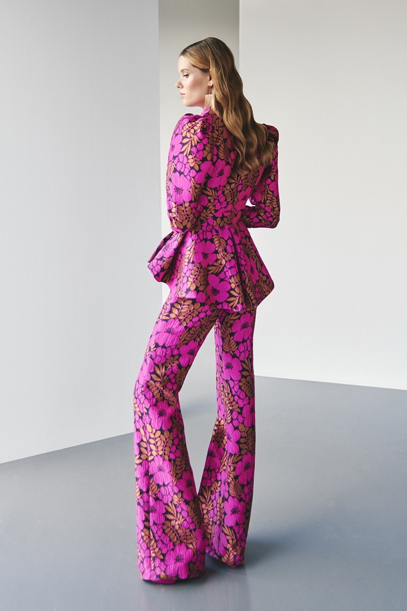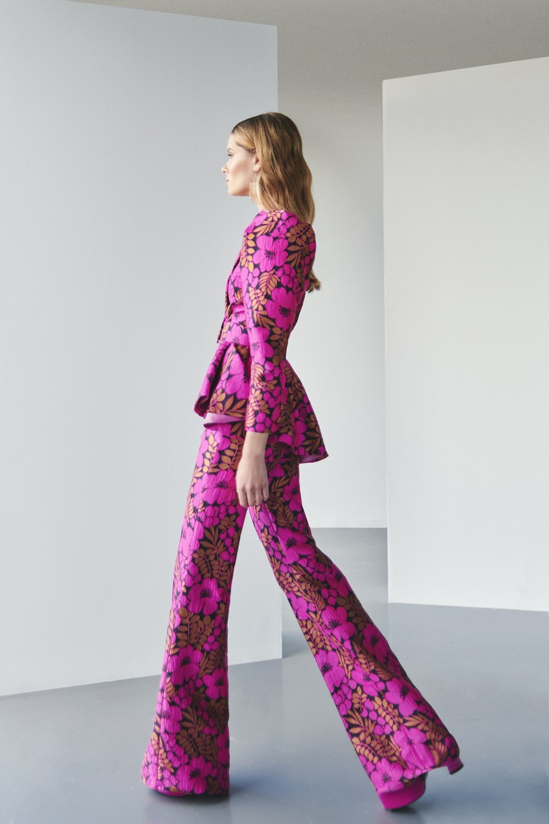 Traje formado por dos piezas, chaqueta y pantalón, confeccionado en un precioso tejido jacquard de flores en color fucsia y cobre. (...)